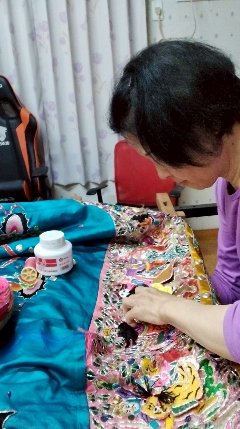 此件使用三十五年的轎頂布因長期曝露於日曬與潮濕環境,布面脆化、刺繡線鬆脫、金蔥線與亮片氧化。修護過程中,先以低吸力乾式清潔去除灰塵,再以溫濕布局部去漬;隨後於背面加襯絲布補強結構,並以相近色絹線補繡斷裂紋樣,修復人物與花草圖案。氧化金線與亮片經防護膠固著,嚴重腐蝕者予以更換。最後以低溫燙整恢復布面平整與立體層次,並以無酸紙包覆保存。經細緻修復後,轎頂布重現原有的華麗色彩與信仰風華,延續其文化與情感價值。