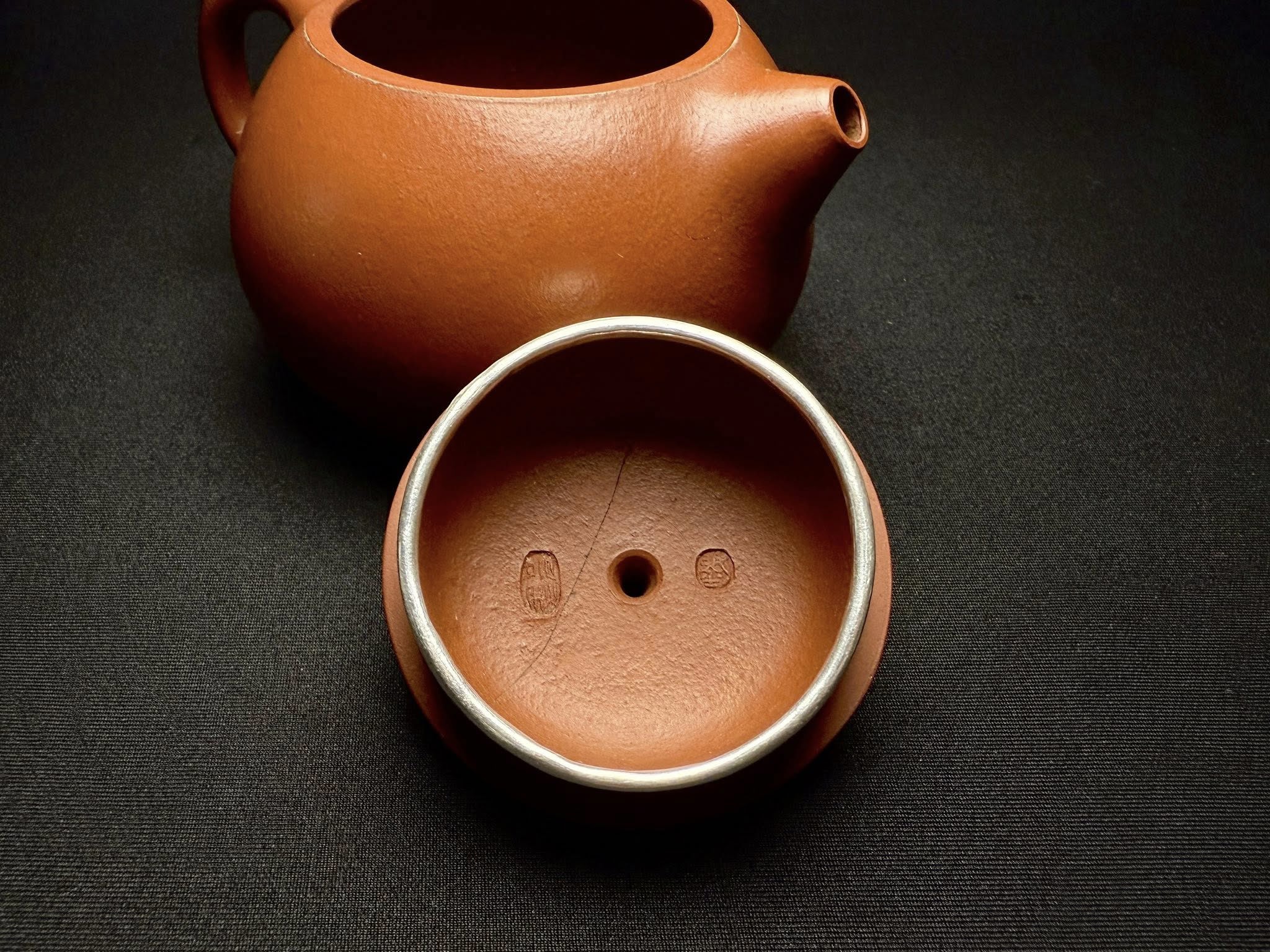 本件《柿成圓滿》朱泥壺修護以重構結構與展現金繕美學為核心。修復初期先以放大鏡檢視裂痕,確認壺蓋雖破為兩半但邊緣完整,隨即以生漆為基底膠合,精準對位後加以固定,並以純銀條包沿重構壺蓋邊緣,使其恢復穩固與精緻比例。待漆層乾固後,以金繕工法進行描繪,使用生漆混合黃金與鉑金粉,沿裂紋勾勒出秋枝與柿果的意象,層層疊上、細筆描繪,讓原本的破痕成為枝脈的延伸。最後經細磨與拋光,使金層呈現柔和光澤,與朱泥本色相互映襯。整體修護不僅恢復壺蓋結構與使用功能,更透過金繕的哲理將破損化為再生之美,寓「柿」為「事」,象徵事事圓滿,也讓修復本身成為時間與美學交融的續篇。