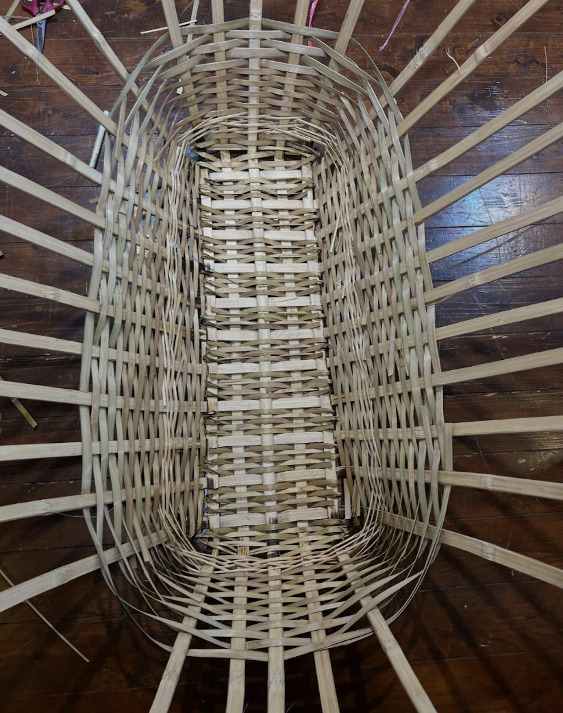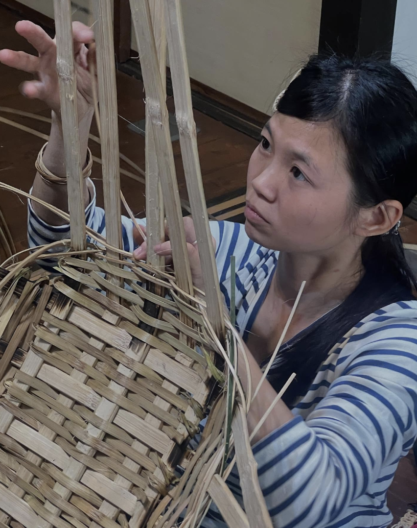 此次復刻的文物為金瓜石採煤礦時使用的拖籃。原器因無師傅能再製,現僅存於博物館展示,因此受託依照片推測工法進行復刻。拖籃為拖運重物所用,材料比一般竹器更厚實粗獷,四角特留孔洞以便穿入竹管作為拖行軌道。此結構展現竹材「剛中帶柔」的特性,能依用途靈活變化——需開孔時改變編製法,需加厚時剪削竹片。整體復刻過程不僅重現礦業工具原貌,也體現前人以竹為材、因用制器的生活智慧。