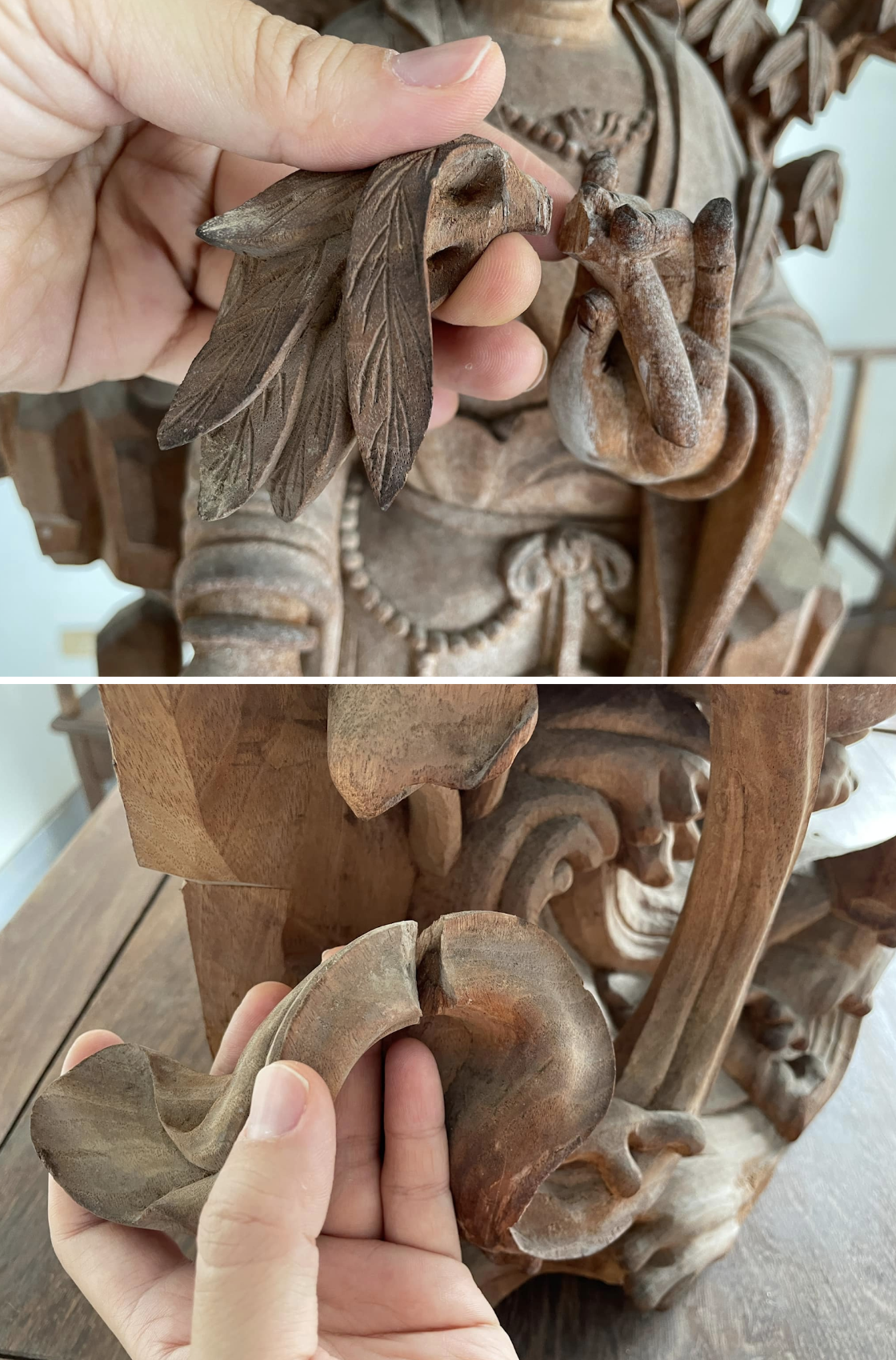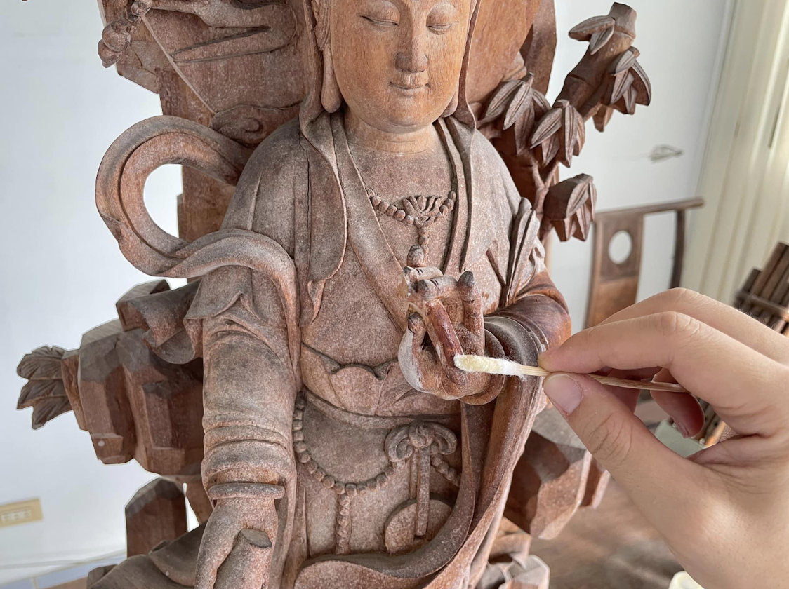 本次修護依循「最小干預」與「可逆性」原則,針對木質菩薩雕刻的結構斷裂與表面乾燥問題進行處理。首先,以中性溶劑與棉棒沿雕刻紋理仔細清潔,去除長年累積的灰塵與污漬,使原有線條與色澤重新顯現。針對斷裂的柳枝與飄帶部分,先比對斷口方向與木紋結構後,以可逆性膠合劑黏合並加壓固定,確保接縫穩固且外觀自然。待結構穩定後,以天然精油與蠟質混合液均勻塗佈全身,補充木纖維流失的油分,讓色澤與光澤回復溫潤。最後施以透明保護漆層,兼具防潮與防氧化功能,並針對前次修補造成的色差進行局部調整,使整體色調柔和一致。經修護後,菩薩雕像不僅恢復結構穩定與表面潤澤,更重現木雕作品特有的溫度與靈韻。