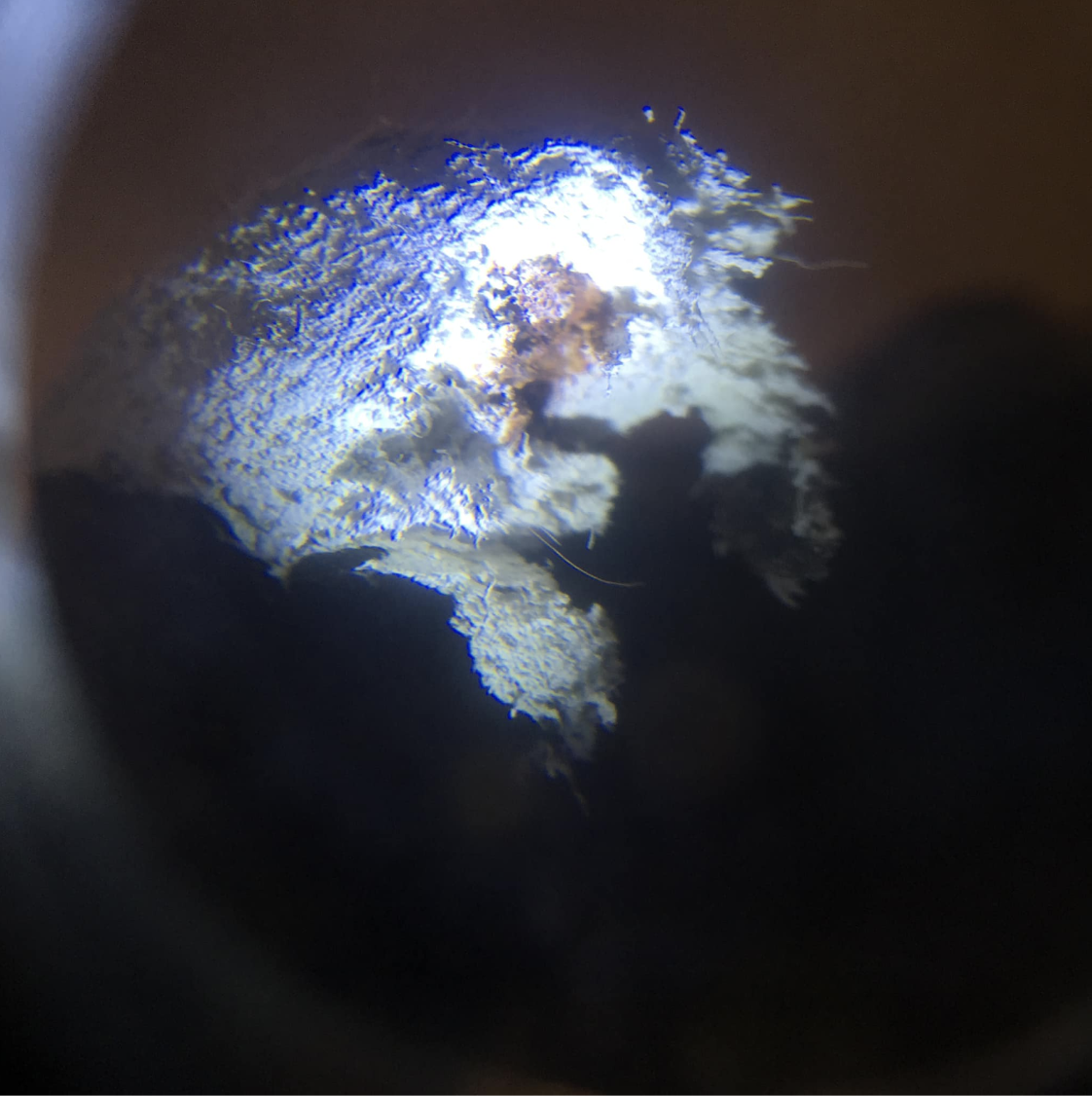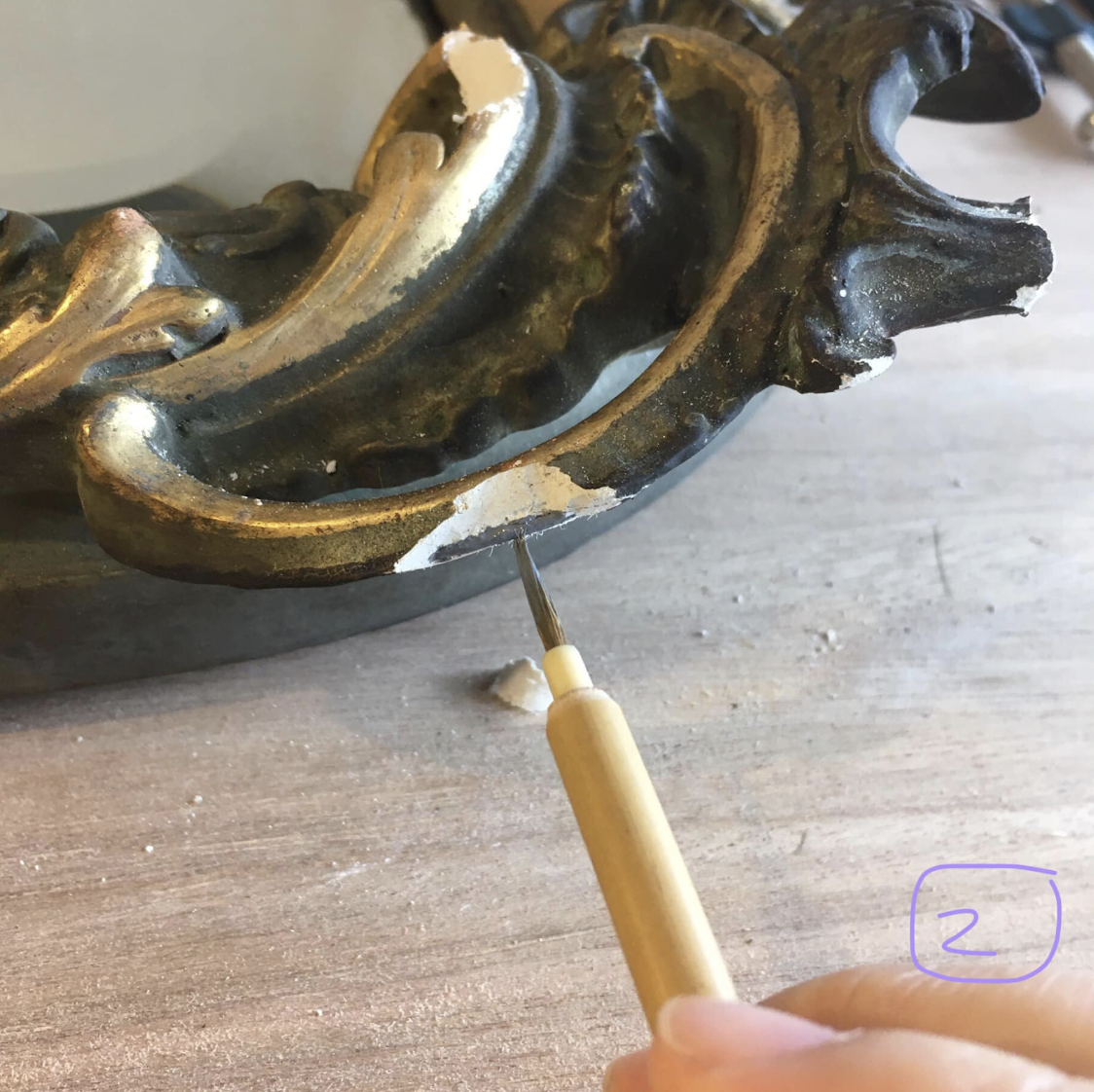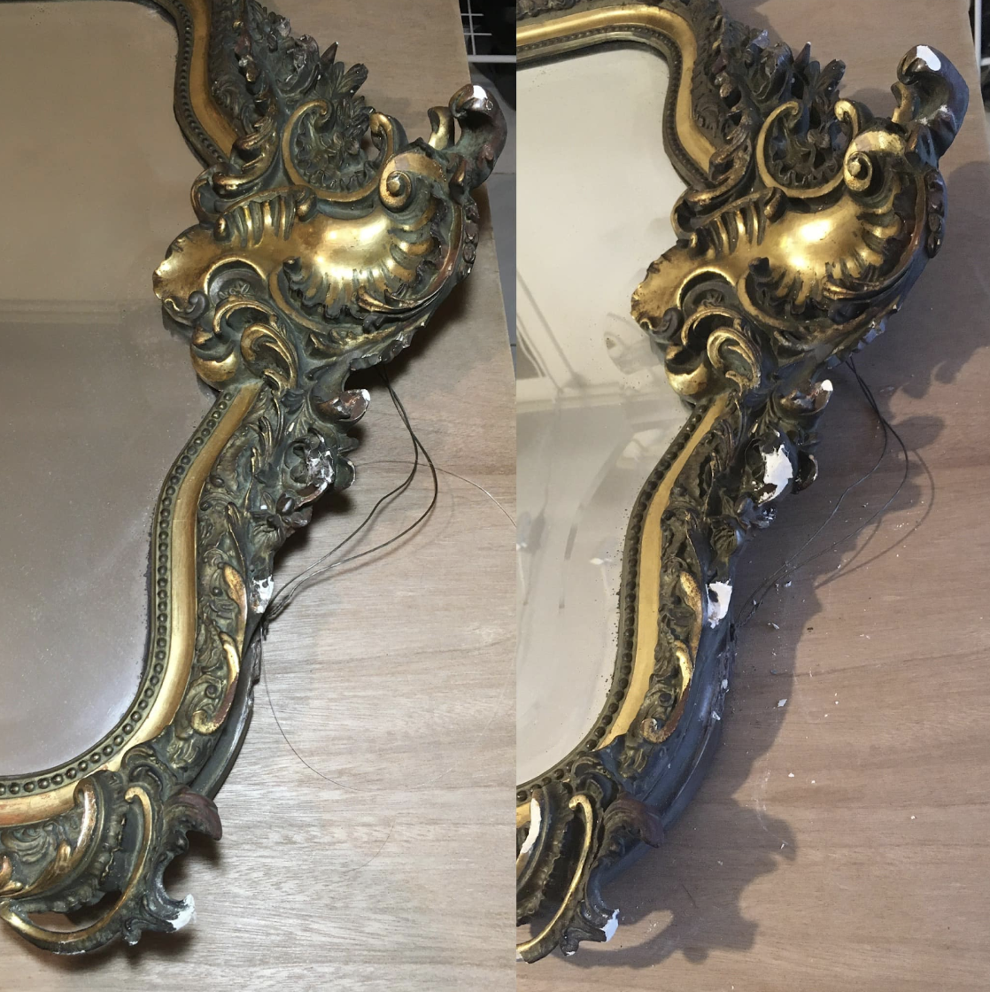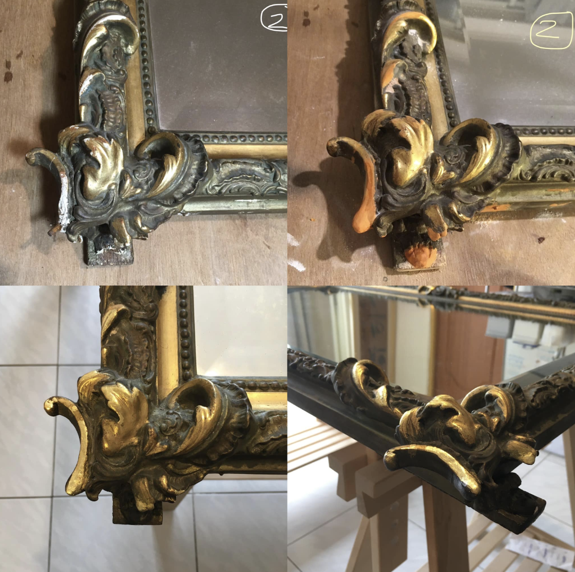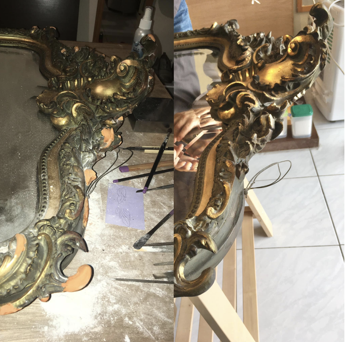 此修護物件源自巴黎古董市場的法式古董鏡框,由香港藏家購得後運回台灣收藏。因存放環境濕度偏高,鏡框內部金屬支架長期受潮氧化,產生嚴重鏽蝕。鏽蝕部位逐漸向外膨脹,導致外層白色結構出現鬆動與粉化,形成類似「壁癌」的剝蝕狀態,不僅影響結構穩定性,也使原本細膩的層次工藝受損。修護需求主要在於徹底清除鏽蝕並穩定結構,同時重建鏡框表層的層次與質感。