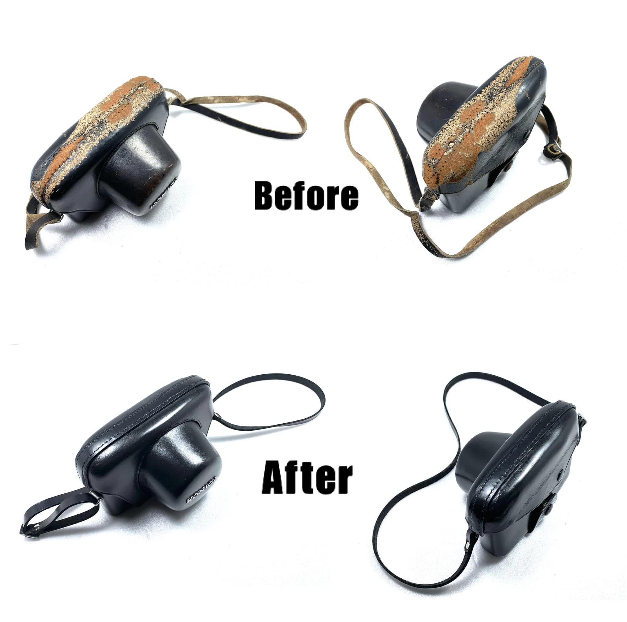 這件老底片相機皮套因長年存放與環境潮濕,導致皮革嚴重氧化、龜裂與脫層,背帶亦乾硬斷裂,整體結構已失去原有韌性與保護功能。初步檢測可見表層油脂流失、纖維斷裂與內裡粉化,外觀幾近報廢。然而,委託人表示這是父親留下的相機套,承載珍貴的回憶與情感,因此希望能修復至可再使用並保存紀念價值。修護需求不僅在於復原皮革外觀,更重點在於「保存記憶與延續情感」,使相機與皮套能再次合為一體,象徵親情的延續與圓滿。