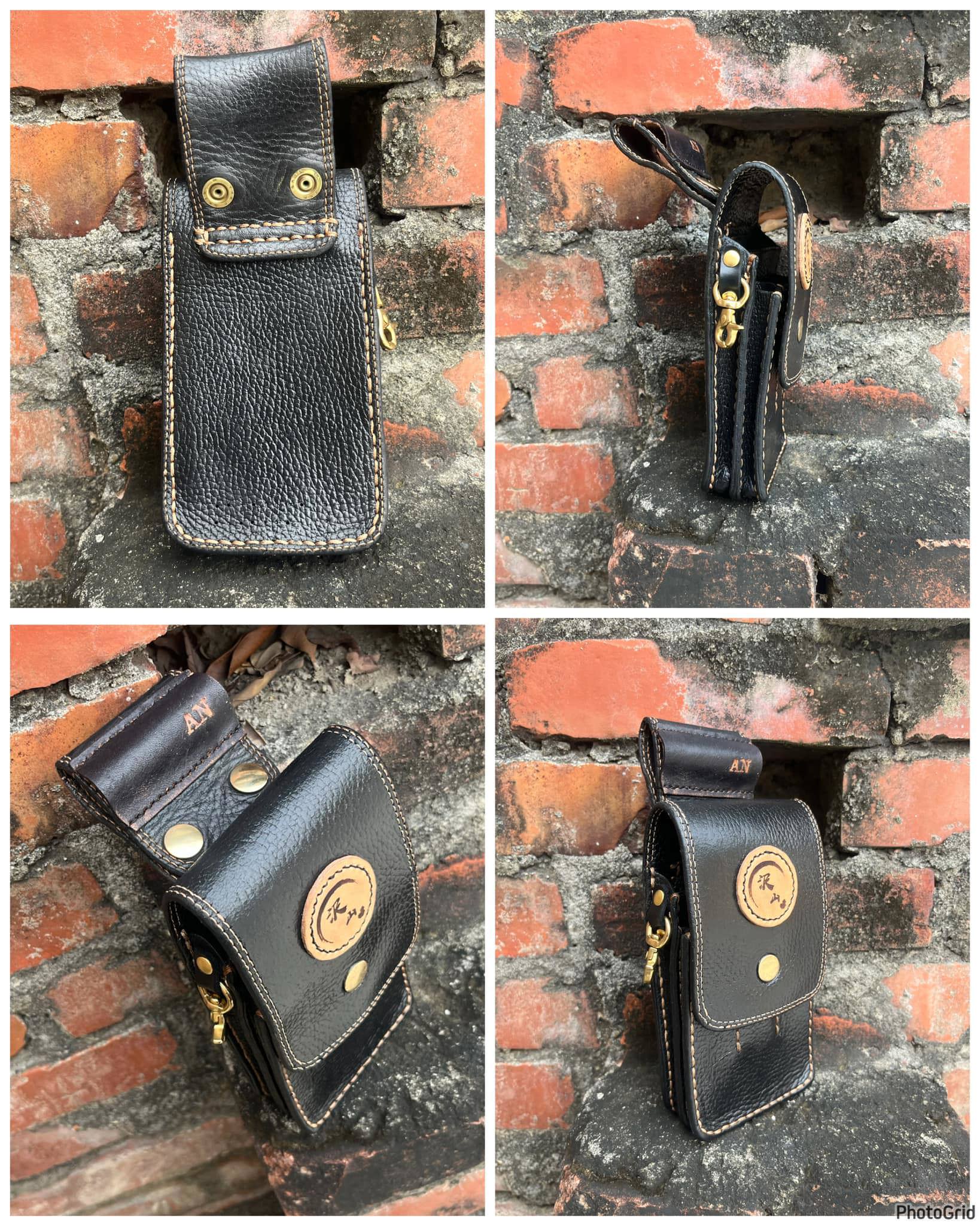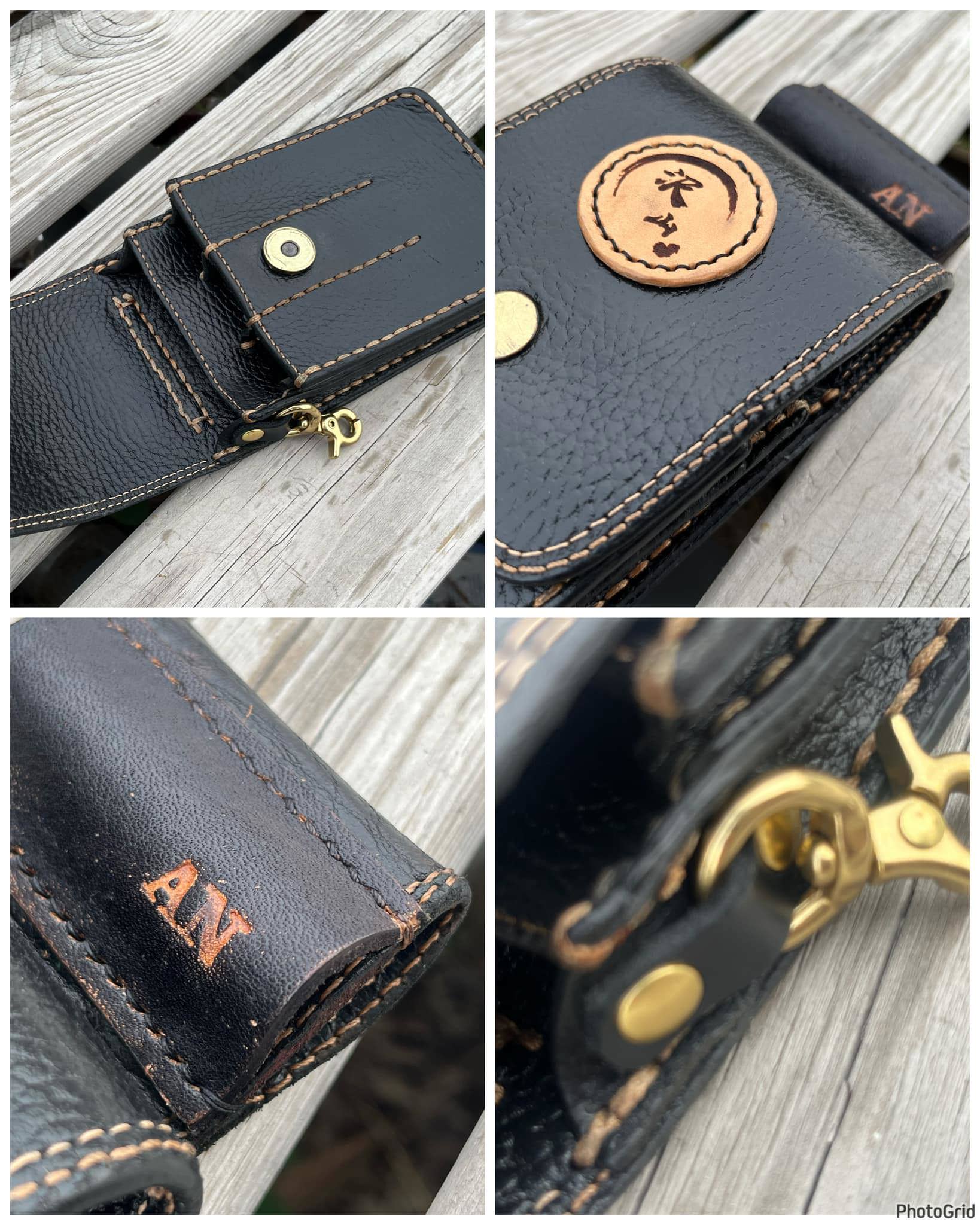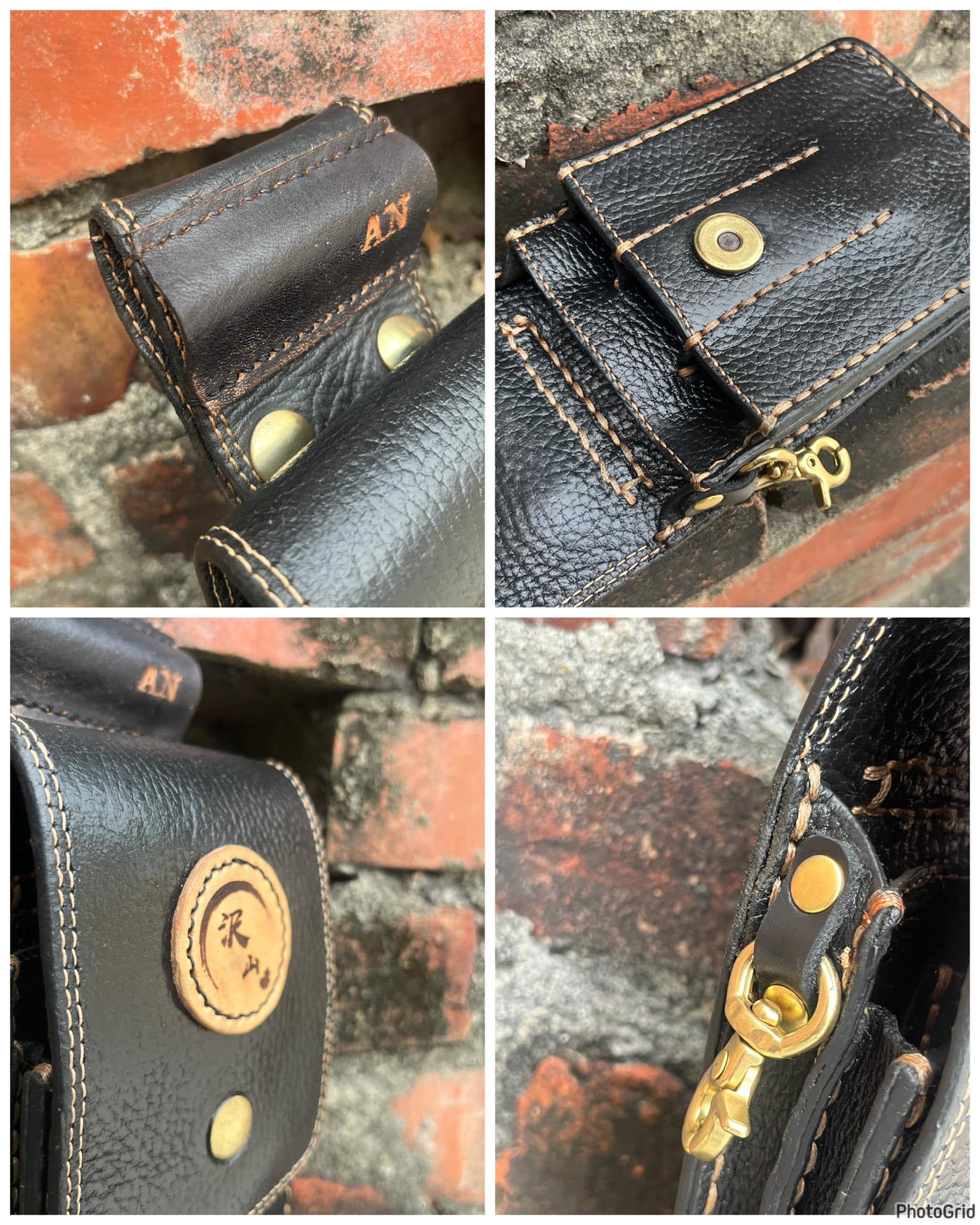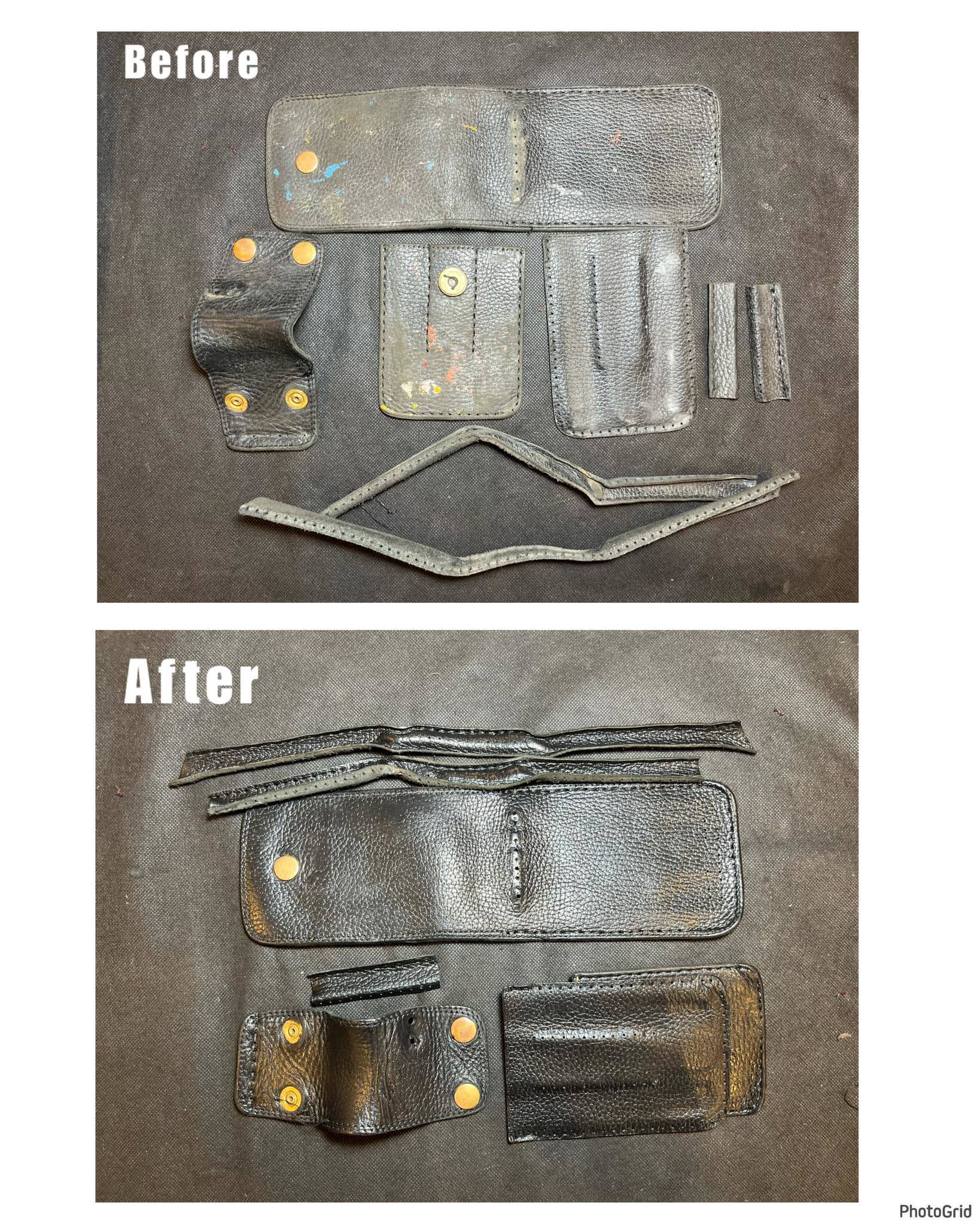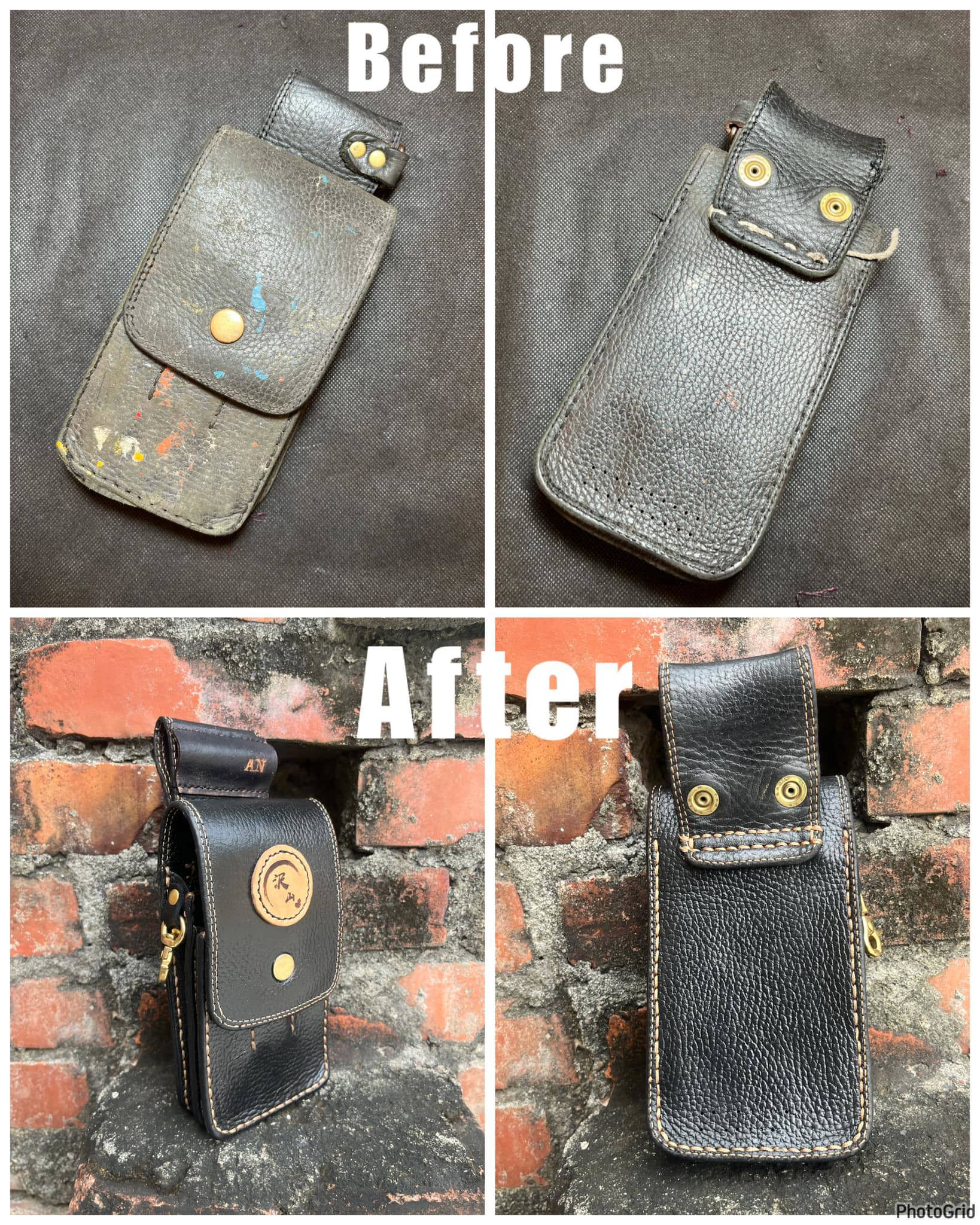 修護前先進行整體清潔與退色區檢測,確認皮革狀況仍穩定後,開始以專用清潔劑去除表層污漬與舊蠟層,恢復皮革毛孔通透性。接著重新調配染料,以接近原色但更深一階的色調分層上染,逐步恢復腰包整體色澤與飽和度。縫線部分則全數拆除,改以耐磨度更高的新線重新縫製,線色與皮革形成對比,使外觀更具層次。五金件重新拋光處理後更換,並新增皮革Logo與筆套,兼具實用與設計感。最後以皮革保養油進行全面上蠟封護,使整體色澤均勻、質感細膩。