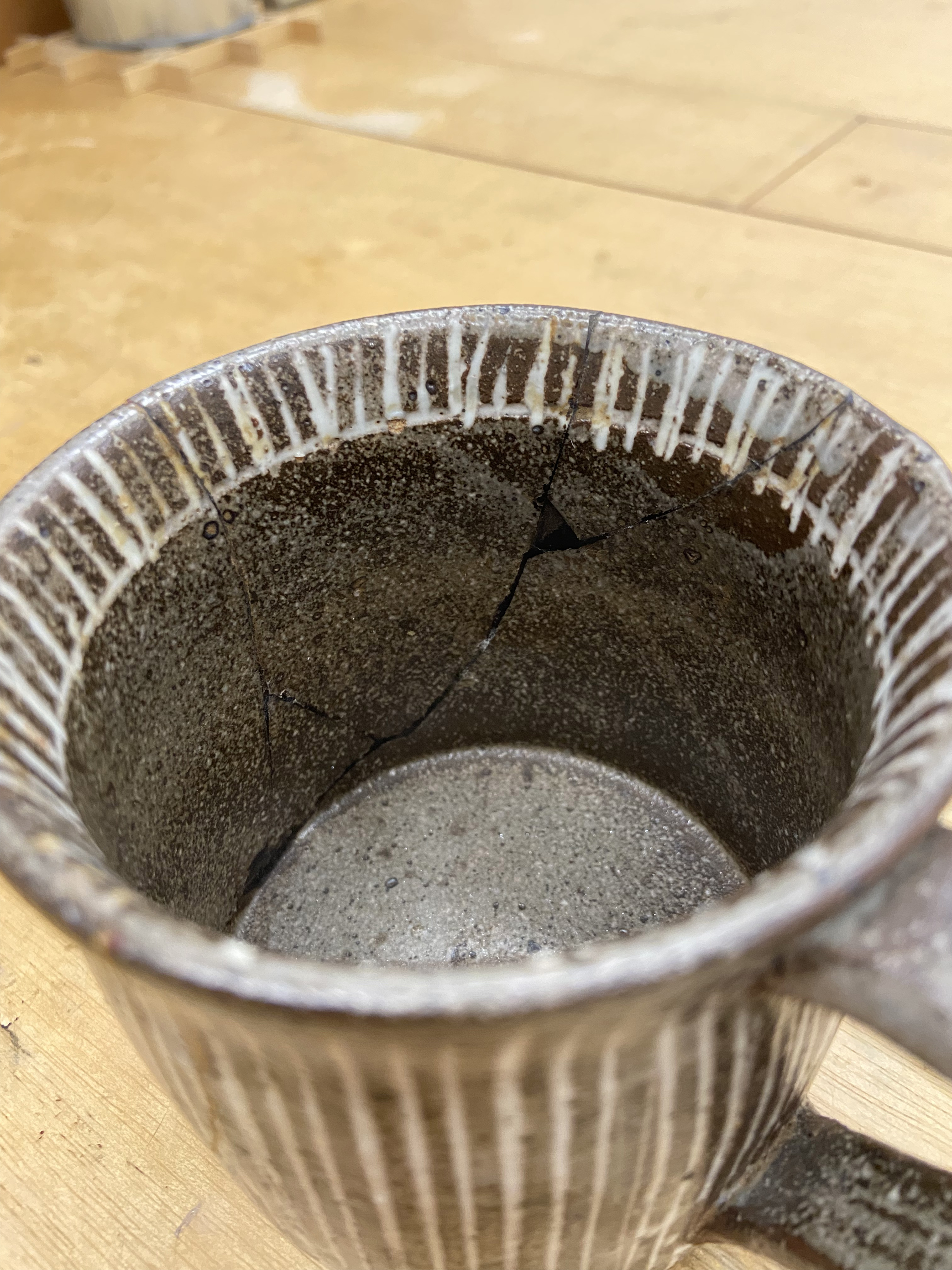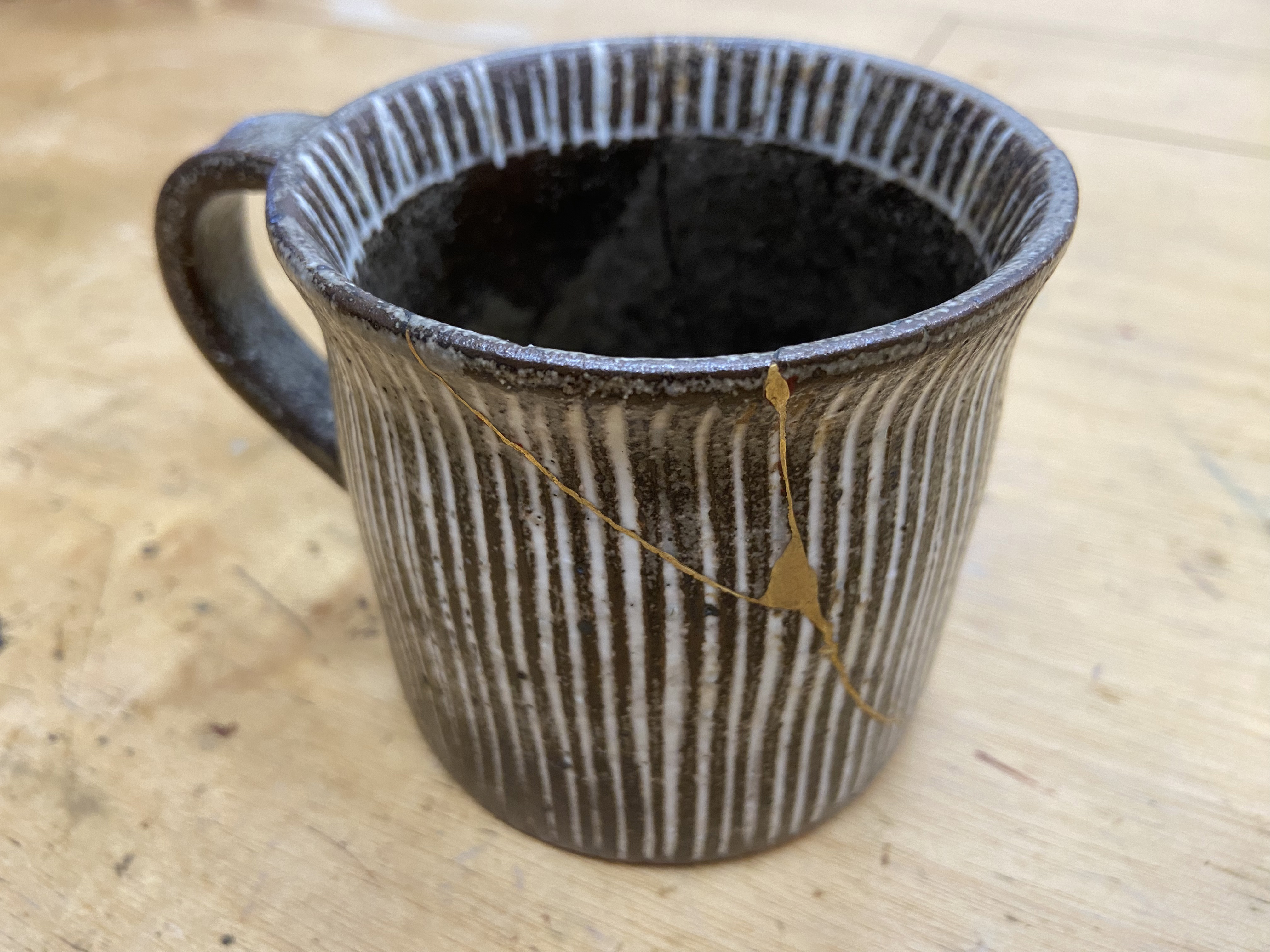 1.接(黏合): 收集碎片,並將其邊緣稍作打磨,同時讓後續的補土能夠附著。然後用生漆跟麵粉調和的「麥漆」黏著劑,將碎片黏合起來。光是黏合到可以使用,約需三週固化時間。