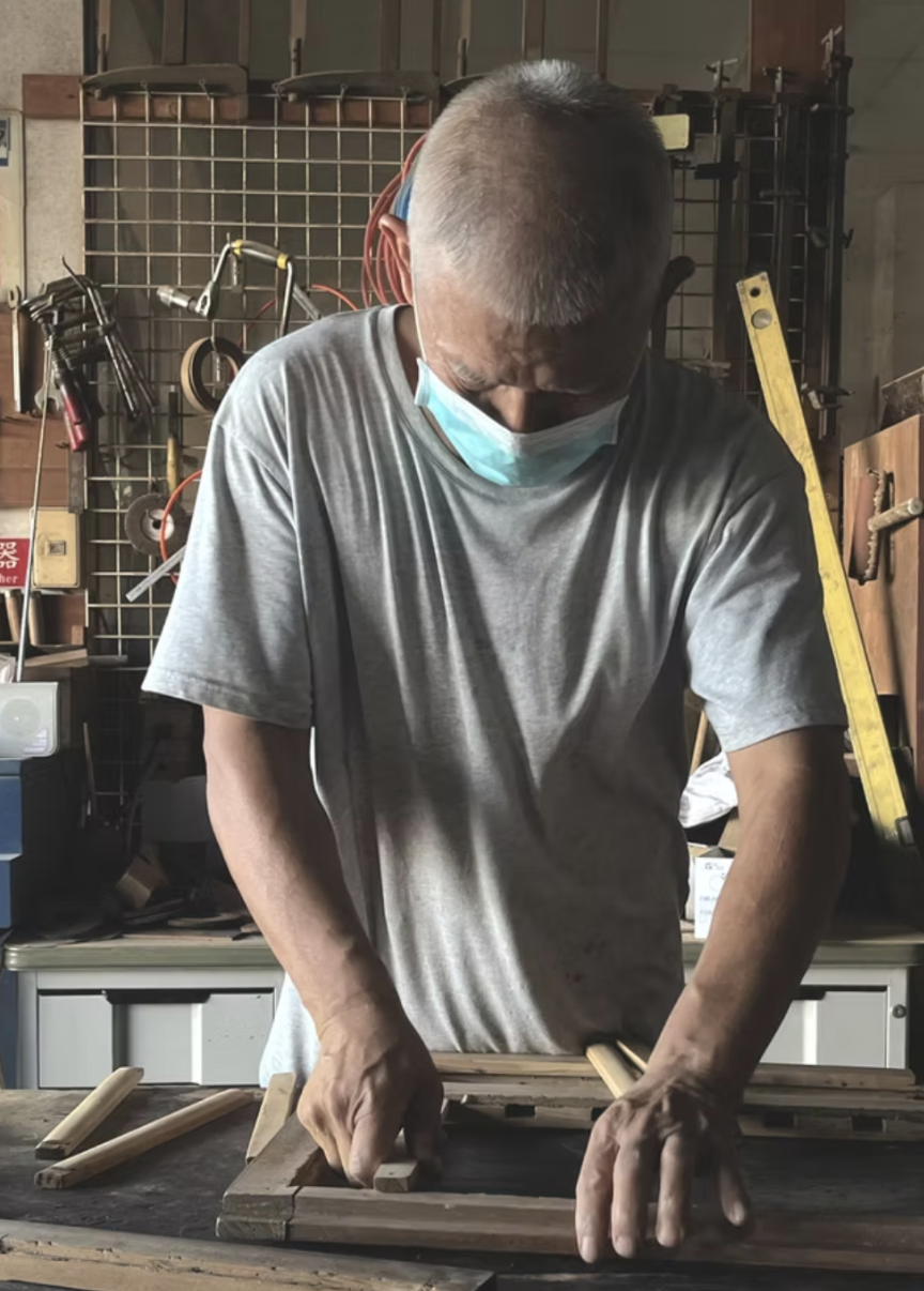 5.試漆與調色: 師傅以試漆的方式,讓老件不顯得突兀或「太新」,以黑、紫、紅色調和,使木頭紋理自然呈現,帶有古味。
