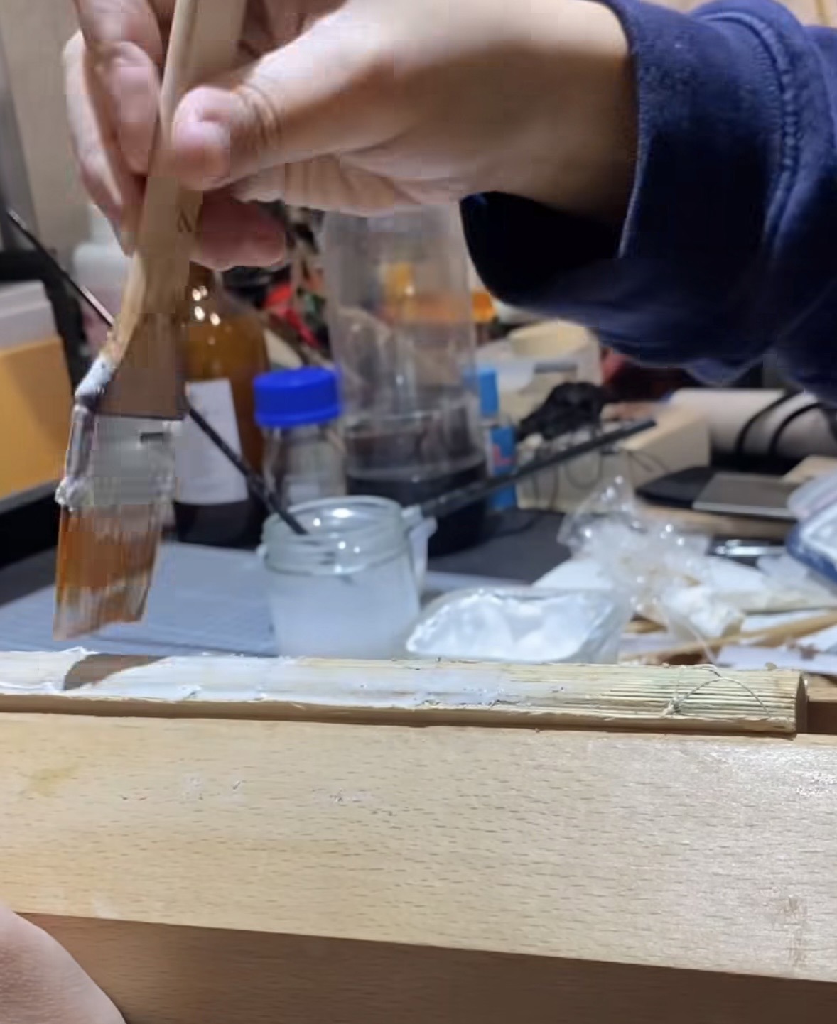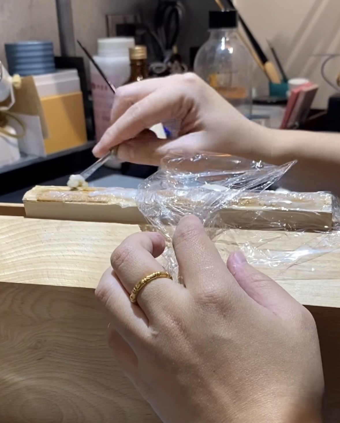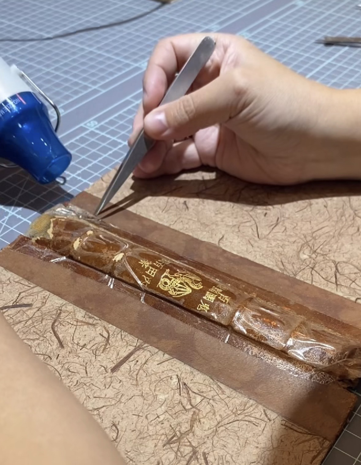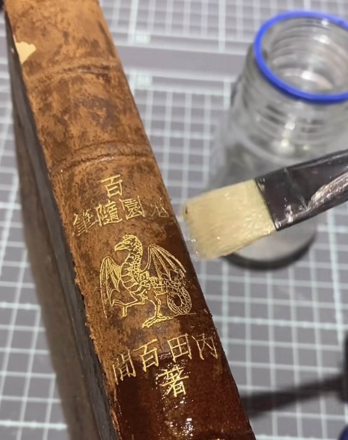 2.去膠:對於難纏的殘膠,她利用熱風槍進行快速移除,對於深層膠漬則使用自煮的漿糊敷著,利用漿糊的黏性軟化並將殘膠與髒污輕輕黏起,避免損傷紙張。