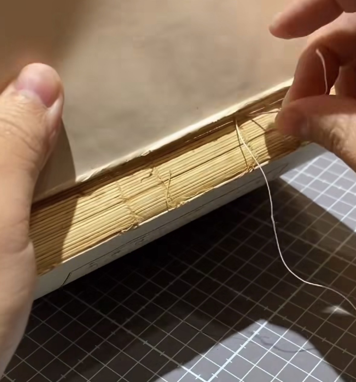 5.組裝精修:選用麻線,依循原本的洞重新縫合書心,在組裝封面時將新的結構布剖開卡紙藏在封面內,使修復痕跡不外露。