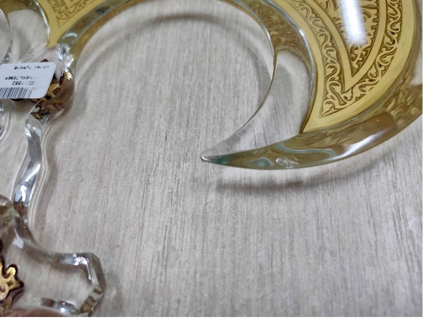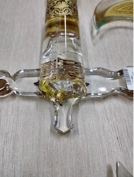 同樣作為憲兵退役的紀念品,蕭銘芚也曾接到一把造形特別、精緻的玻璃斧頭修護委託。這把斧頭在斷裂後,委託人也曾試著用環氧樹脂(AB膠)自行黏合,但黏合處因時間久遠而變黃,在晶瑩剔透的玻璃斧頭上顯得格外分明、失去美感;底部也因撞擊留下了明顯的缺損痕跡。