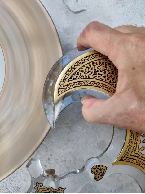 3.拋光:以海綿砂輪機進行更細細緻的拋光,隨後以含有氧化鈰的皮輪加水進行拋光。