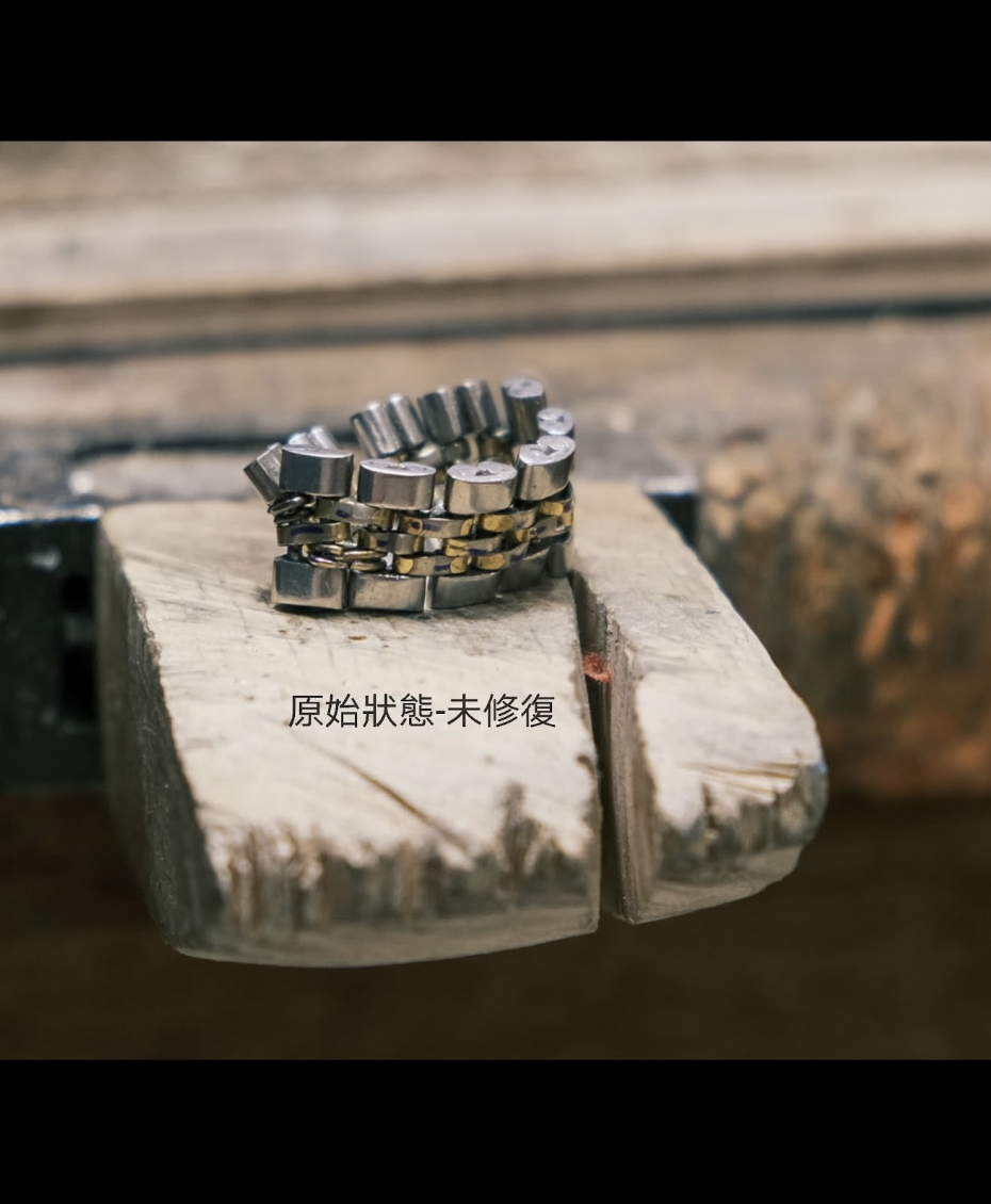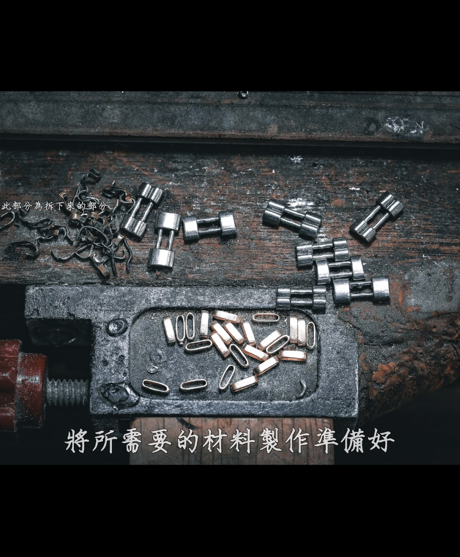 1.評估與材料準備:康琮侑判斷,原結構件因太薄且合金配比不佳,無法單純焊接修補。他決定採用更高規格的材料進行結構重建。他選擇了硬度較高、合金配比更精準的 14K 金 (58.5%純金、其餘的 41.5% 則為合金,成分包括銀、銅、鎳和鈀金),並親自配製合金。