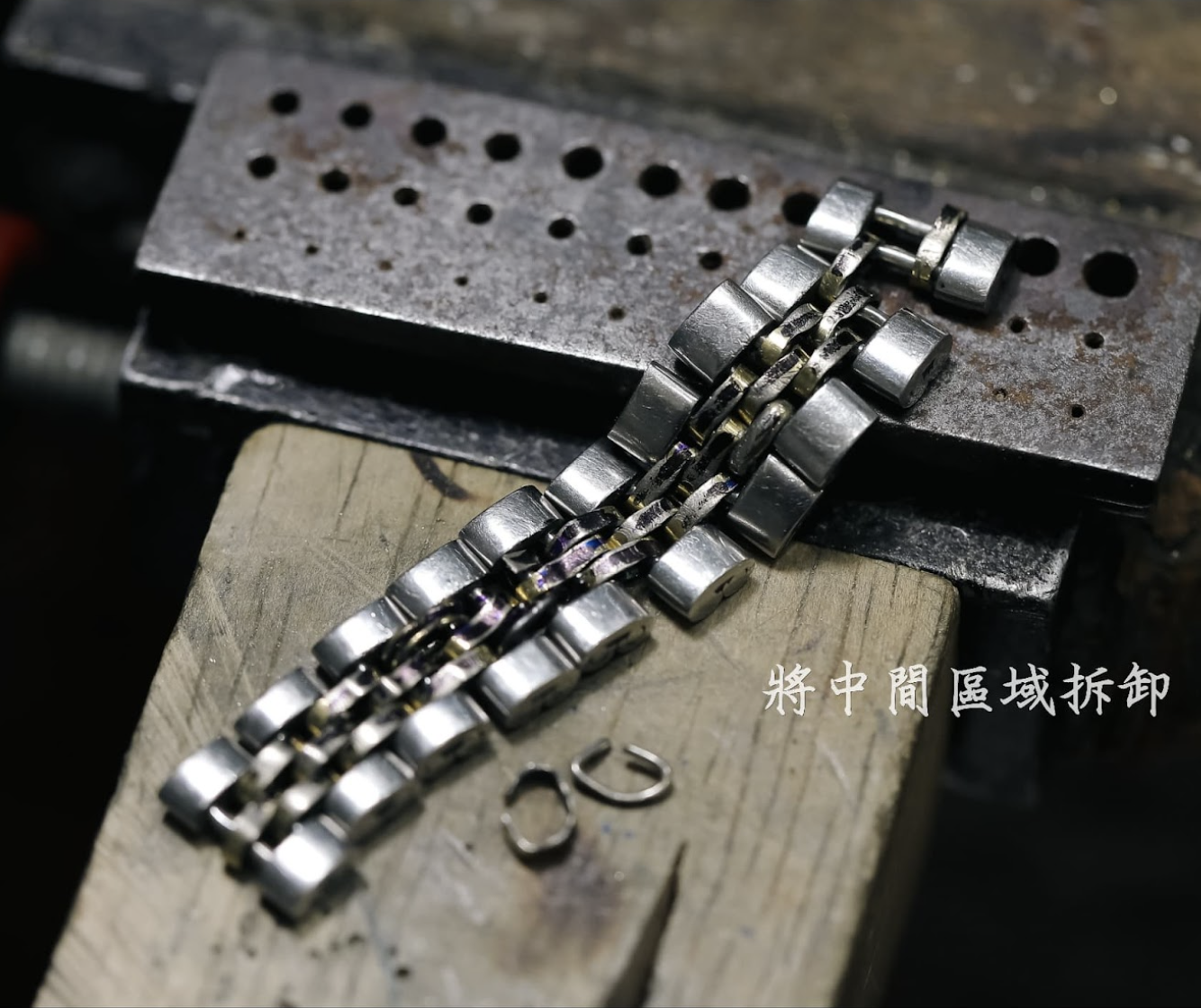 5.串接與敲入:接著,他將新的 14K 金元件一邊串入、一邊用小榔頭輕敲固定。由於零件尺寸精確,串接必須順暢且穩固。