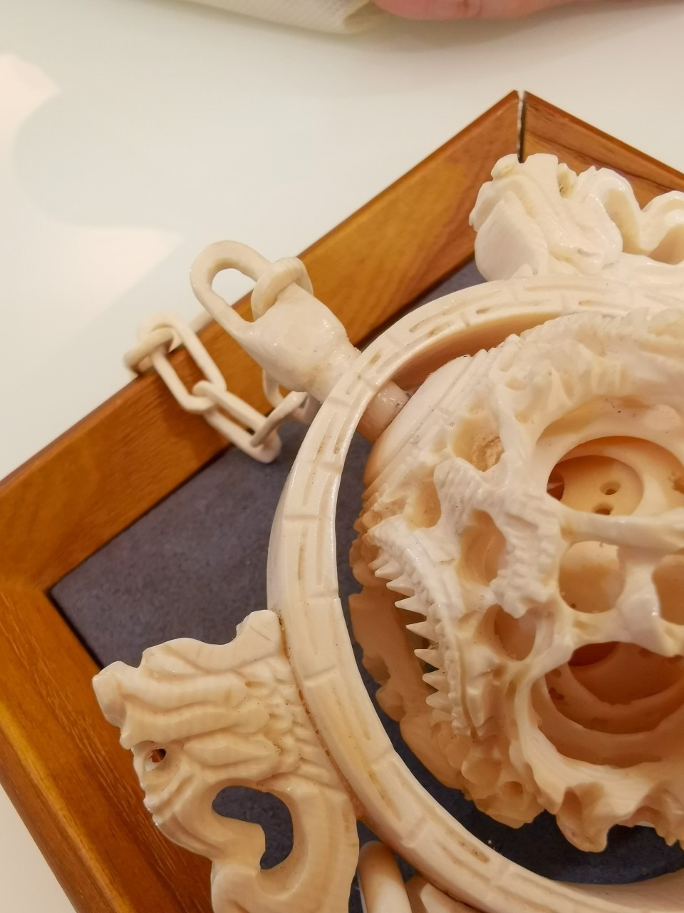 鬼工球安靜地躺在柔光照落的桌面上,層層相扣的球壁因斷裂而微微錯位。康琮侑俯身,指尖沿著破損的象牙邊緣輕輕滑過,像在觸摸一段被截斷的歷史。他輕轉內部球體,那微弱的卡阻聲在沈默的房間裡格外清晰——仿佛在向他訴說失衡與期待修復的心情。這顆工藝繁複的鬼工球,不只是技術上的挑戰,更是承載著記憶與遺憾的器物,而他正準備讓它再度轉動。