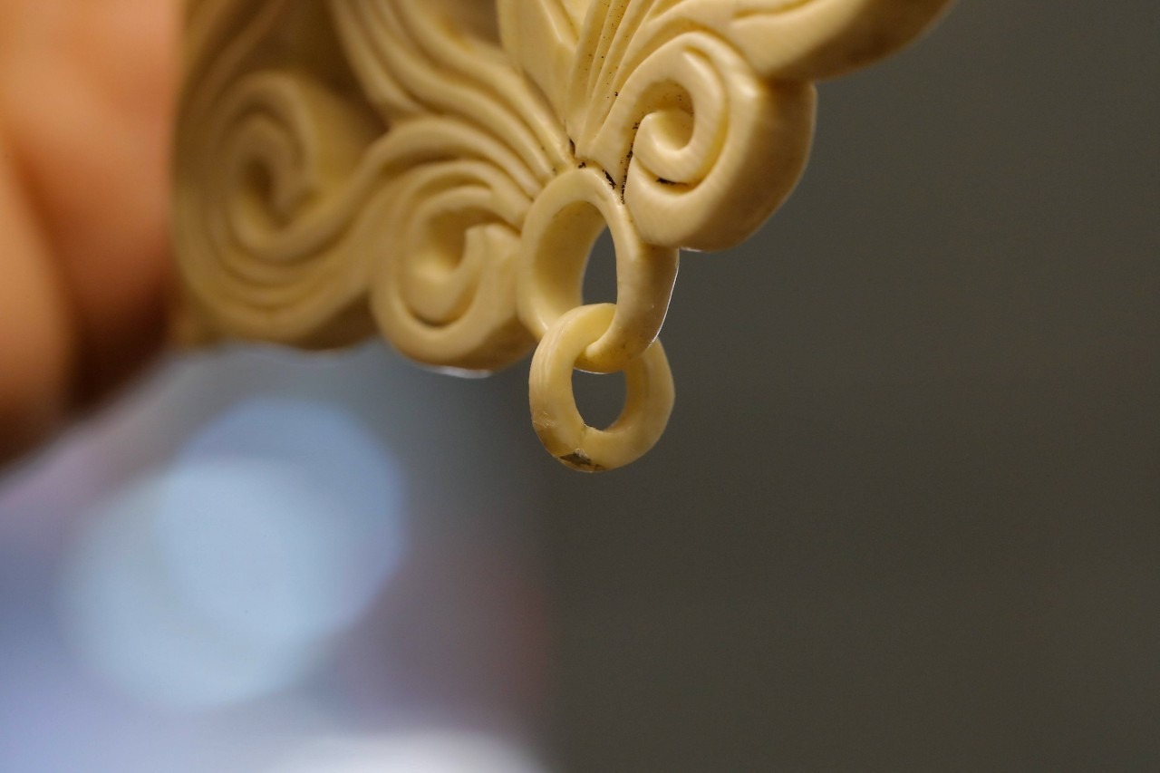 - 精製與焊接「跳圈」:將用於連接的金屬圈(「跳圈」)精準地焊接到嵌入象牙基座的白K金片上。此舉成功繞開了象牙無法直接焊接的難題,將上下斷裂結構牢固地連接在一起。