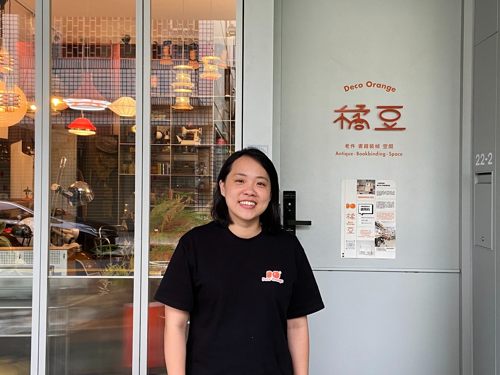 在橘豆工作室亮白檯燈下,林秀蔓老師細心修補縫合手上書籍,將書籍裡的文化記憶加以留存。