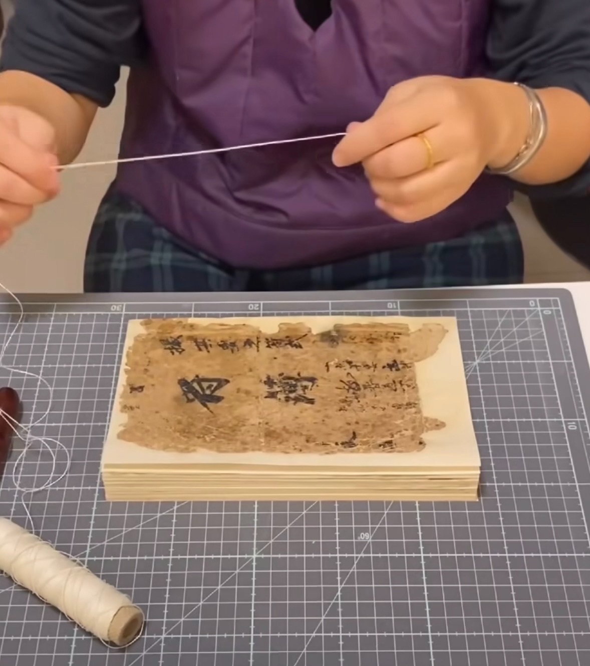 - 組裝與縫合: 用手術刀清理雜質、油污。重新打洞、使用麻線(耐久性高),依循原本的縫法重新縫書。