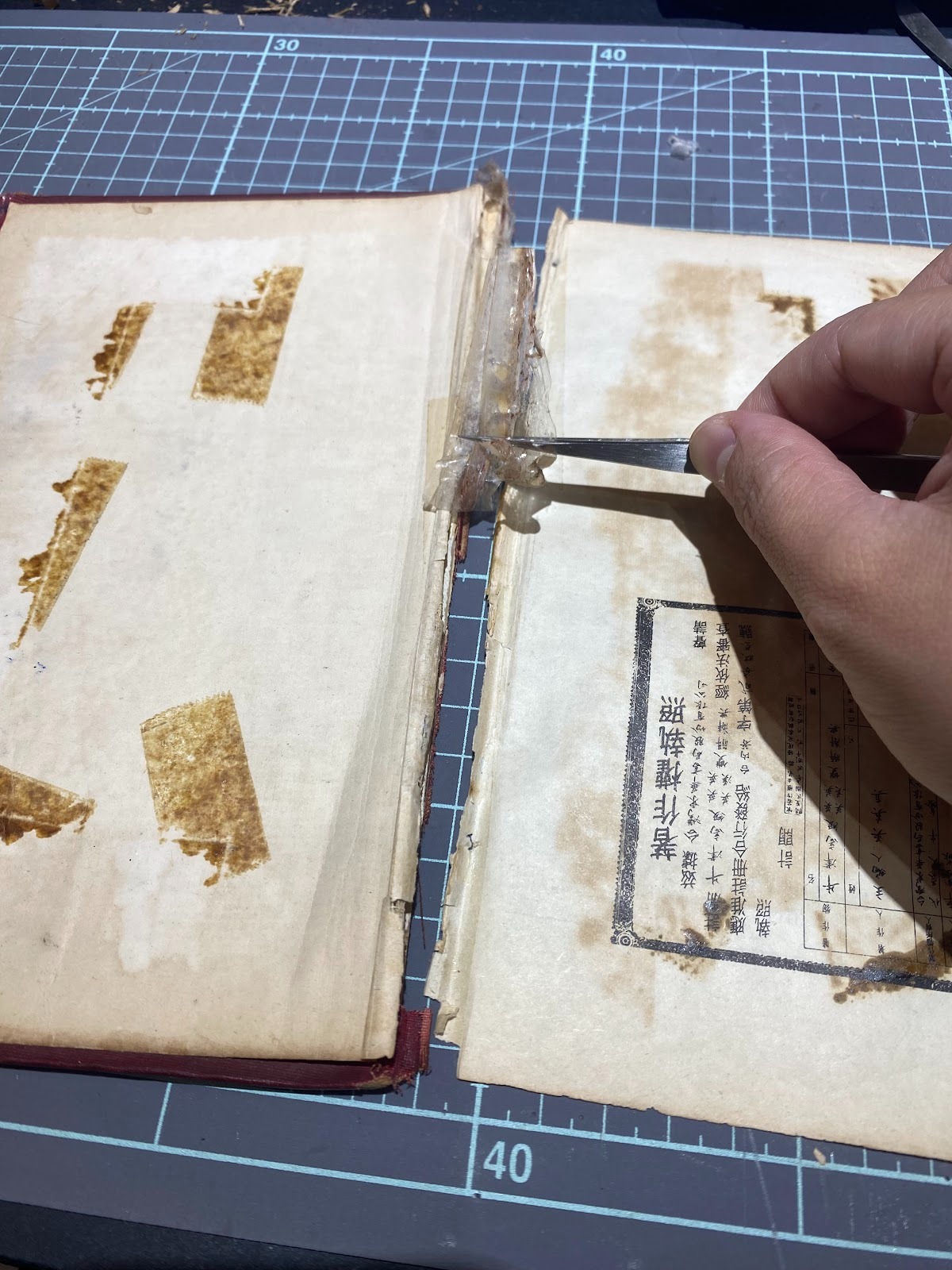 - 去膠:對於難纏的殘膠,她利用熱風槍及有機溶劑進行移除,對於書脊上深層膠漬則使用自煮的漿糊敷著,利用漿糊的黏性軟化並將殘膠與髒污輕輕黏起,避免損傷紙張。