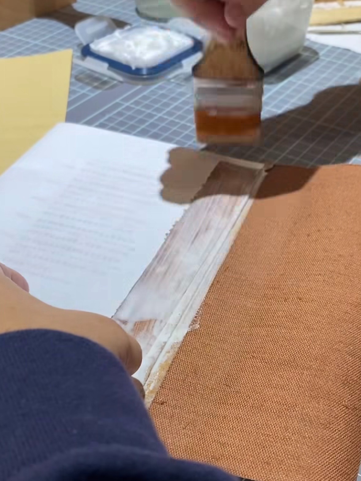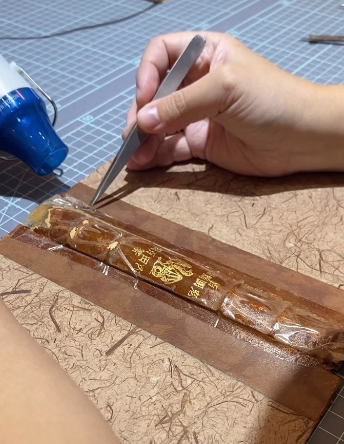 - 去膠:對於難纏的殘膠,她利用熱風槍進行快速移除,對於深層膠漬則使用自煮的漿糊(可逆性材料)敷著,利用漿糊的黏性軟化並將殘膠與髒污輕輕黏起,避免損傷紙張。