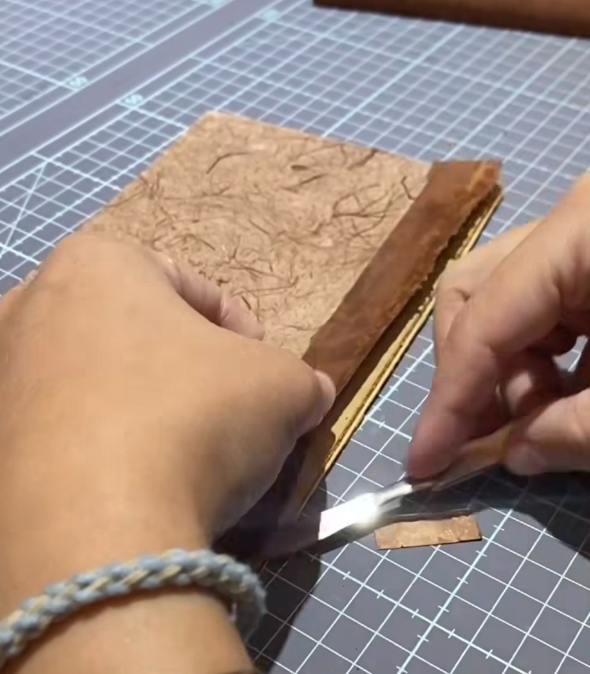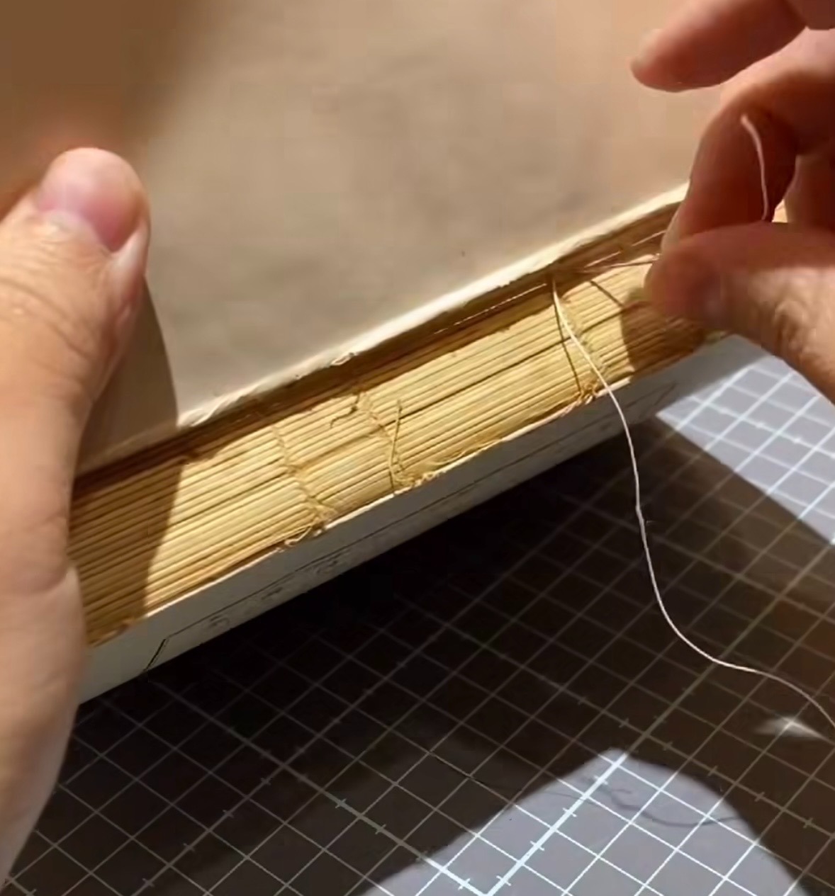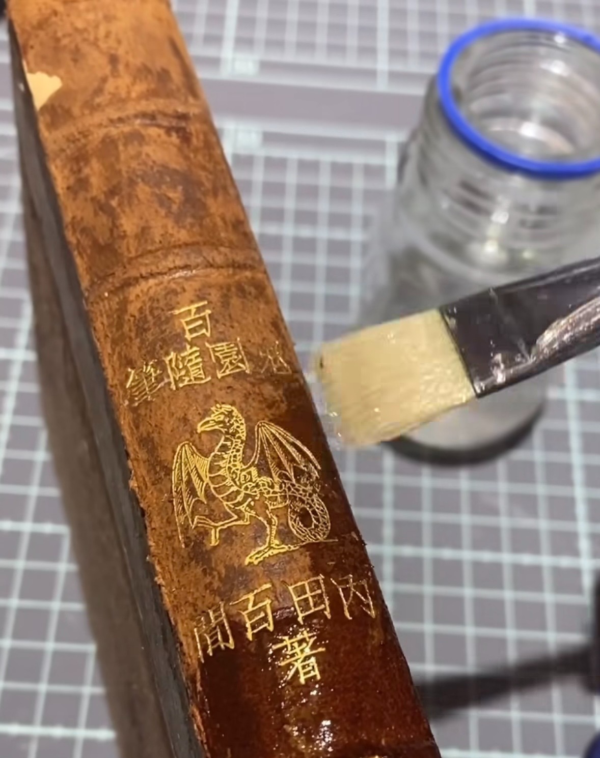 - 組裝精修:重新縫合書心後,在組裝封面時她會將新的結構布剖開卡紙藏在封面內,使修復痕跡不外露。縫合則選用麻線,依循原本的洞不會額外打洞,像做手作新書一樣完成修復。
