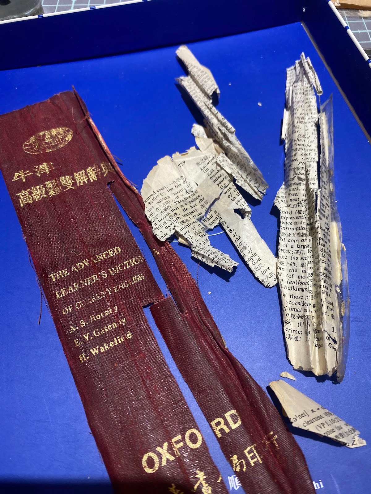 這本1950年代的中英字典被攤放在修復桌上時,書頁早已不再完整。林秀蔓老師輕輕翻開封面,映入眼簾的是密密麻麻的筆記痕跡——那是委託人從事翻譯工作數十年間,一頁頁累積下來的使用痕跡。為了固定破損,委託人過去曾自行貼上膠帶。只是,年代久遠的膠帶早已失去原本的支撐功能,化學膠質反而滲入紙纖維中,在頁面上留下難以逆轉的黃褐色斑塊。膠帶的膜層脫落後,只剩下一層黏膩的膠漬,牢牢咬進紙張,成為修復時最棘手的障礙之一。書籍的結構狀況同樣令人憂心。書脊內負責連接書心與封面的布料,已從中段完全裂開,使封面與內頁失去支撐,如同少了鋼筋的建築,只剩外殼勉強撐著。內頁也因縫線斷裂而四散成碎片,每一小塊紙片上,幾乎都殘留著舊膠帶的痕跡,增加了整理與拼合的難度。加上這類西書多為雙面印刷,任何補強與修補都必須顧及正反兩面的閱讀與視覺完整性,無法任意覆蓋。這本字典的修復,已不只是單一破損的處理,而是一場需要循序拆解、耐心重建的細緻工程。