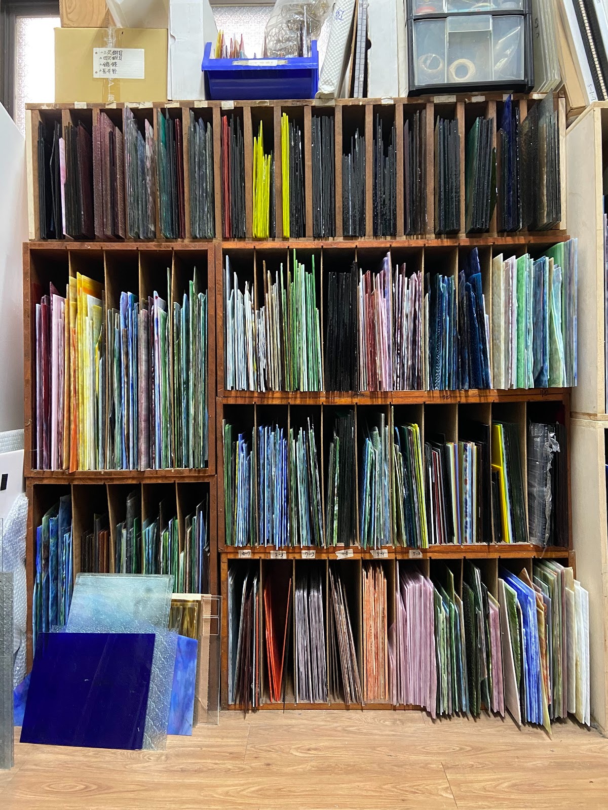切割與處理:將找到的新玻璃依照版型切割下來,接著進行磨邊,確保邊緣光滑且尺寸能精確貼合,特別是對於幾何圖形的作品,尺寸必須精準到分毫不差。