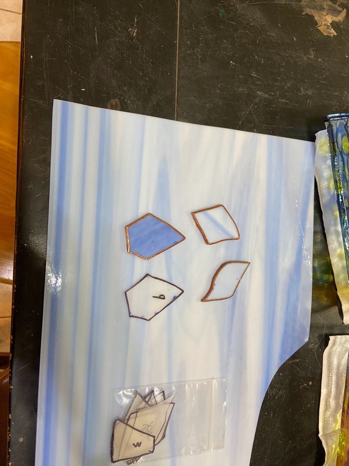 拆解破碎件:首先必須將烙鐵加熱,讓舊有的銅箔或鉛框結構鬆脫。接著用工具將殘餘在結構中的舊玻璃夾出,若破碎不夠完整,則需要進一步敲碎才能完整取下,防止殘餘的碎屑影響後續的製版。