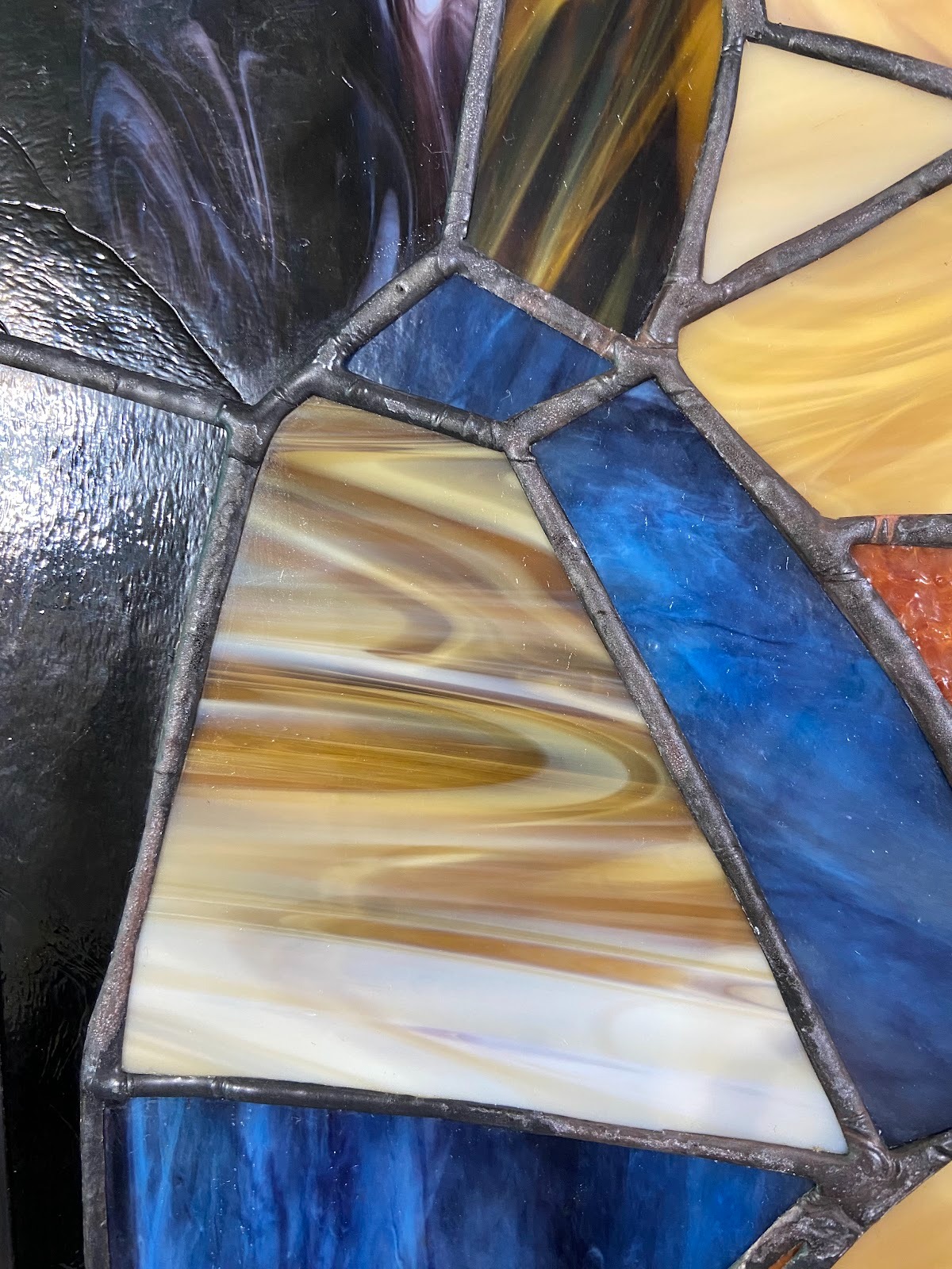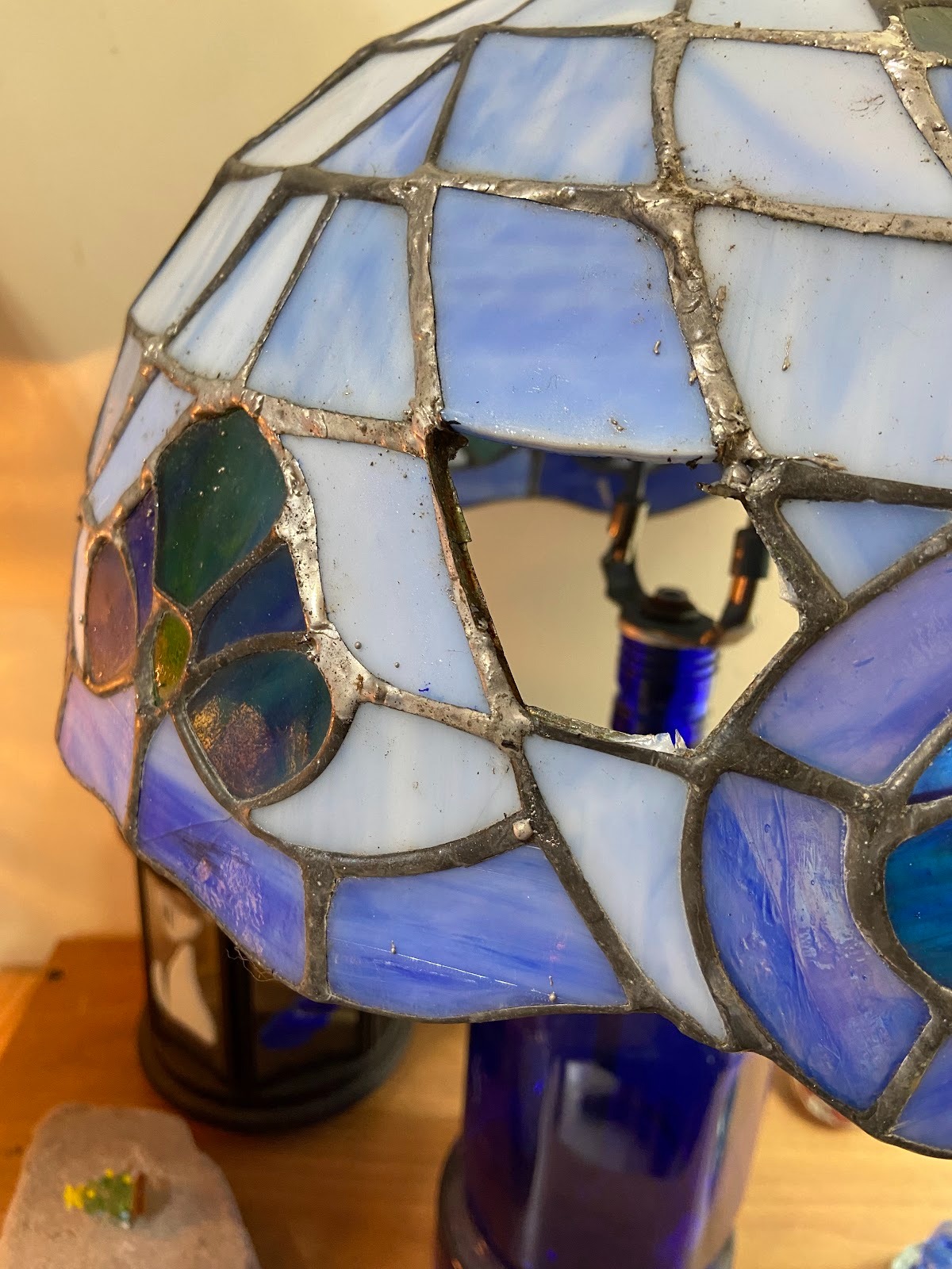 重新鑲嵌:在邊緣包上銅箔,再用烙鐵進行焊接,將新玻璃牢固地固定回燈罩結構中。