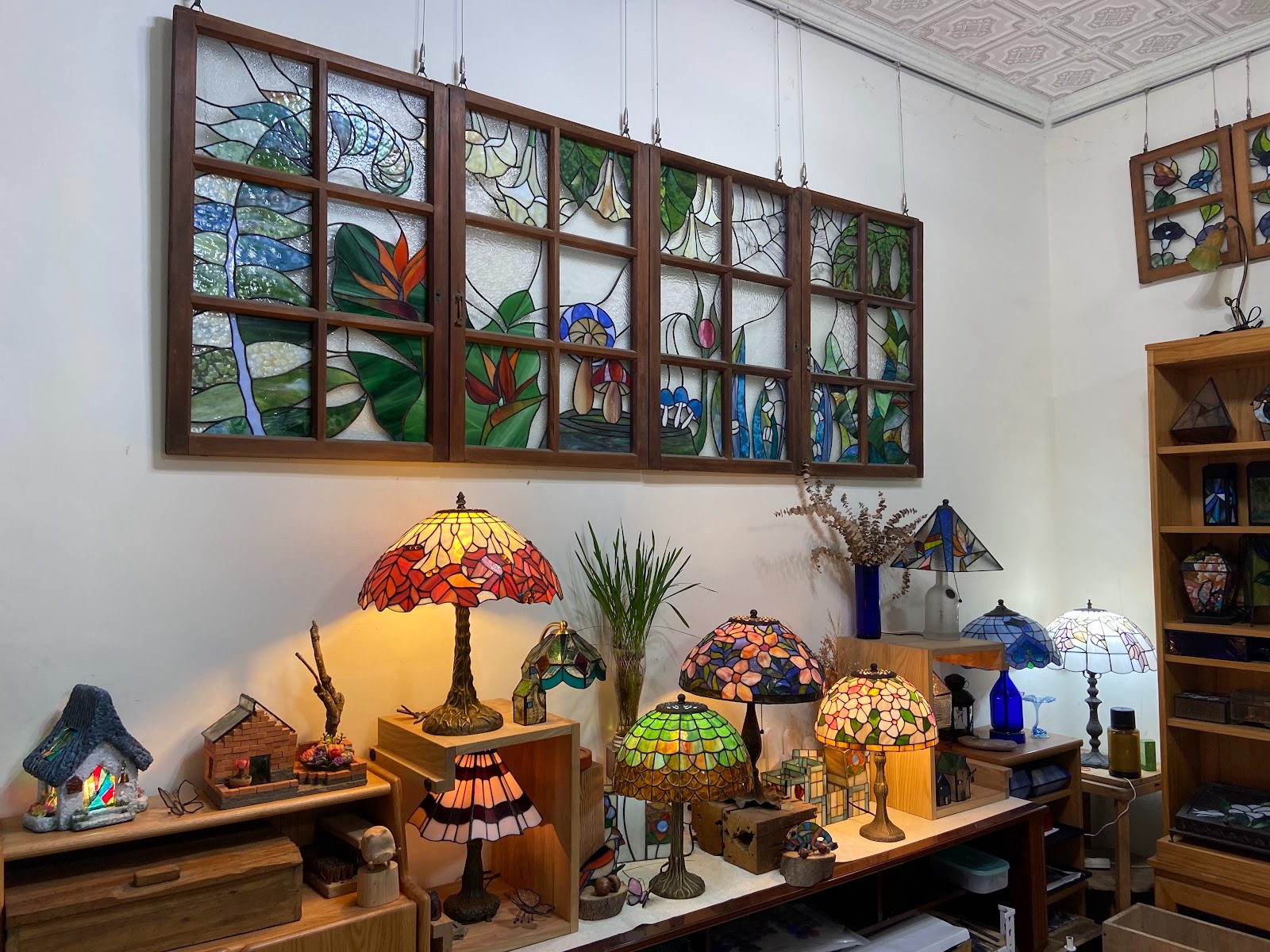 在積累了足夠的知識與技巧後,莊老師創立了玲・巧手創工坊,把自己走過的學習路徑系統化,設計出一整套從零開始的鑲嵌玻璃課程。 為了打破這門工藝在臺灣長期處於冷門的現狀,工坊的課程不只教單一技法,而是以四大主軸來設計:玻璃鑲嵌、玻璃嵌畫、玻璃嵌框,以及玻璃窯燒。課程設計層次分明:針對未接觸者開設「體驗課」;想學技術的有「工藝養成班」與「工藝進階班」;更有進階的「鉛框製作班」旨在讓學員能夠製作如落地窗上那樣的大型作品。莊老師說:「其實我每一個課程我都會教修復啦」,在她的觀念裡,會做作品的人,也必須有能力在作品受損時把它救回來,修復,是工藝師的一部分。為讓學員有實戰經驗,莊老師曾特別開設燈飾修復課。她從外銷工廠買回幾盞破損嚴重的 Tiffany 燈作為教材。課程公告後,學員反應異常熱烈:「我都還沒有宣傳出去,光是來教室的學生看到後,每個都報名」,導致後續報名者竟然面臨「沒有燈可以修了」的窘境這個小插曲,反而證明了市場上對專業修復技術的真實需求。然而修復工作也面臨著材料稀缺帶來的重大挑戰。許多來自世界各地的古董燈或作品,其玻璃片早已停產,就算工坊有能力修好結構,也未必找得到同款玻璃。因此,莊老師在教學中也特別強調:如何在維持作品整體感的前提下,找到「最合適的替代方案」,讓作品既被尊重,又能繼續存在。她也觀察到,那些學會鑲嵌玻璃、懂修復的學生,往往也會更細心地照顧自己的作品。