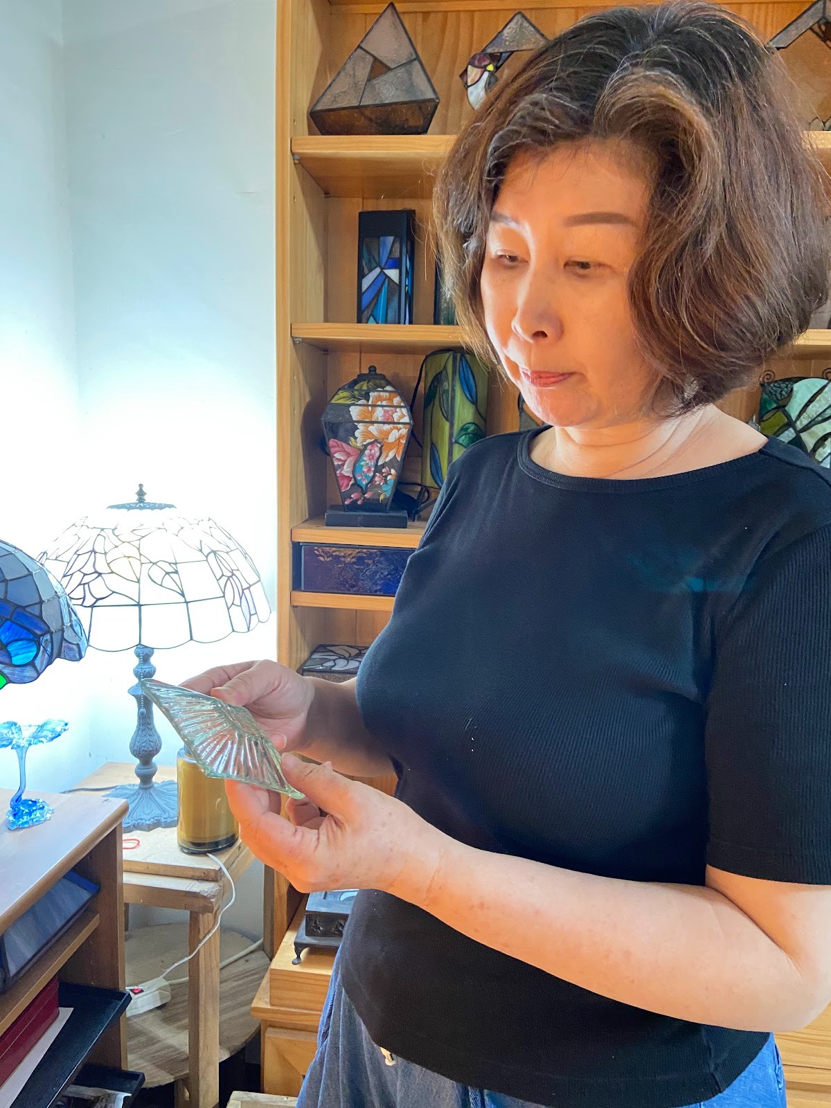 教室裡的燈罩被暫時卸下,放在工作桌中央。 幾片破損的玻璃缺角,讓光線從裂縫中漏出不規則的邊緣。莊慧玲拿起其中一片,用手指背輕輕推了推, 又轉動整個燈罩對著光看色彩的變化; 一旁的學生則低頭描著版型,準備替那塊缺口找回最接近的顏色。在玲・巧手創工坊裡, 鑲嵌玻璃不只是一門工藝課, 而是一種把「美」重新拉回日常生活、替人把回憶接回來的方式。
