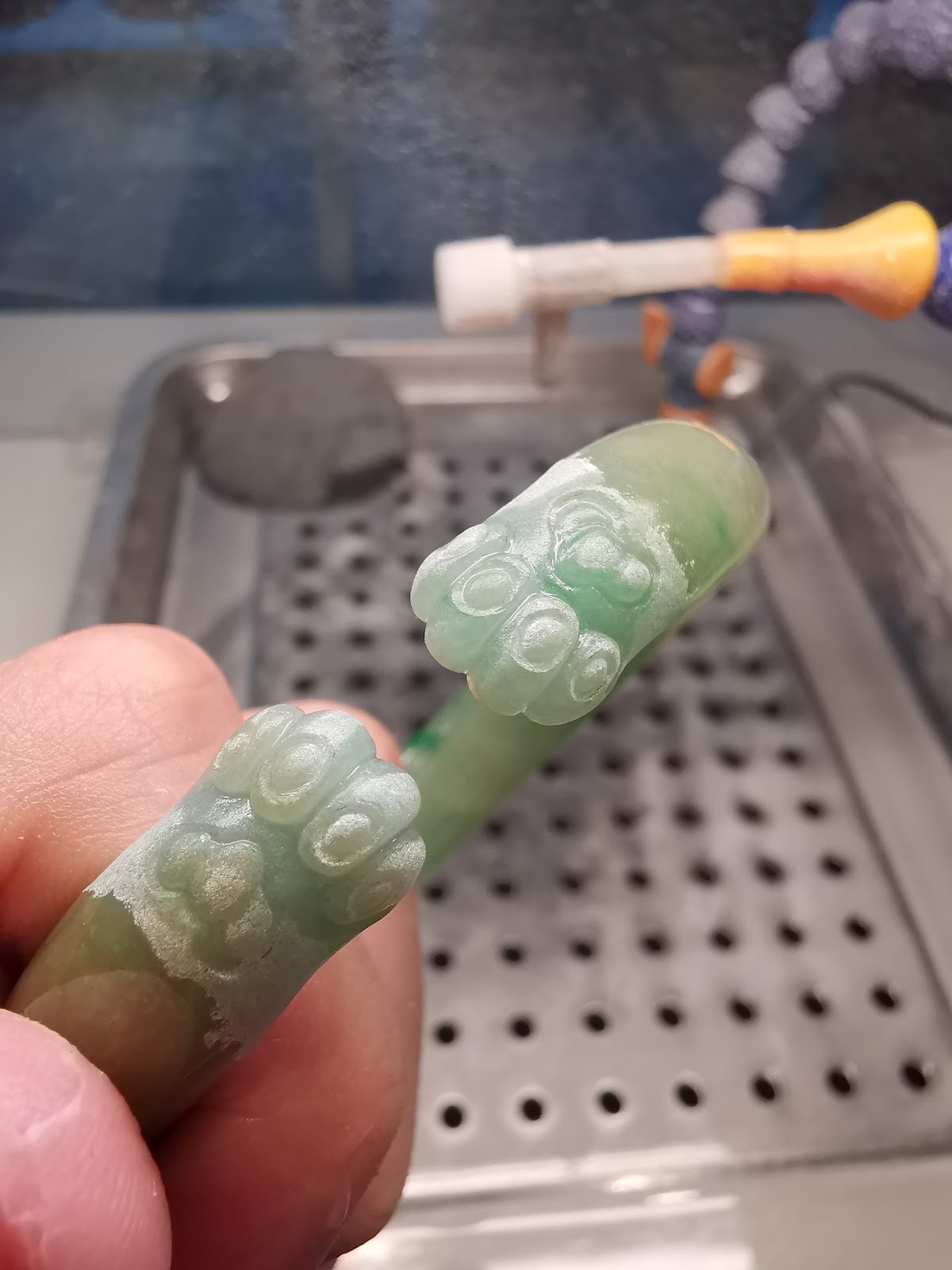 - 分階段研磨與精細拋光:從粗(120 號)到細(400號)的砂紙逐步研磨,徹底消除雕刻痕跡。隨後使用研磨膏與鑽石粉進行大規模拋光。針對貓爪造型中難以觸及的細小溝槽,蔡汶諺老師以竹子切削成尖角,裹上鑽石粉進行精密摩擦與拋光,確保玉牌每一個細節都能呈現出珠光寶氣的亮度。