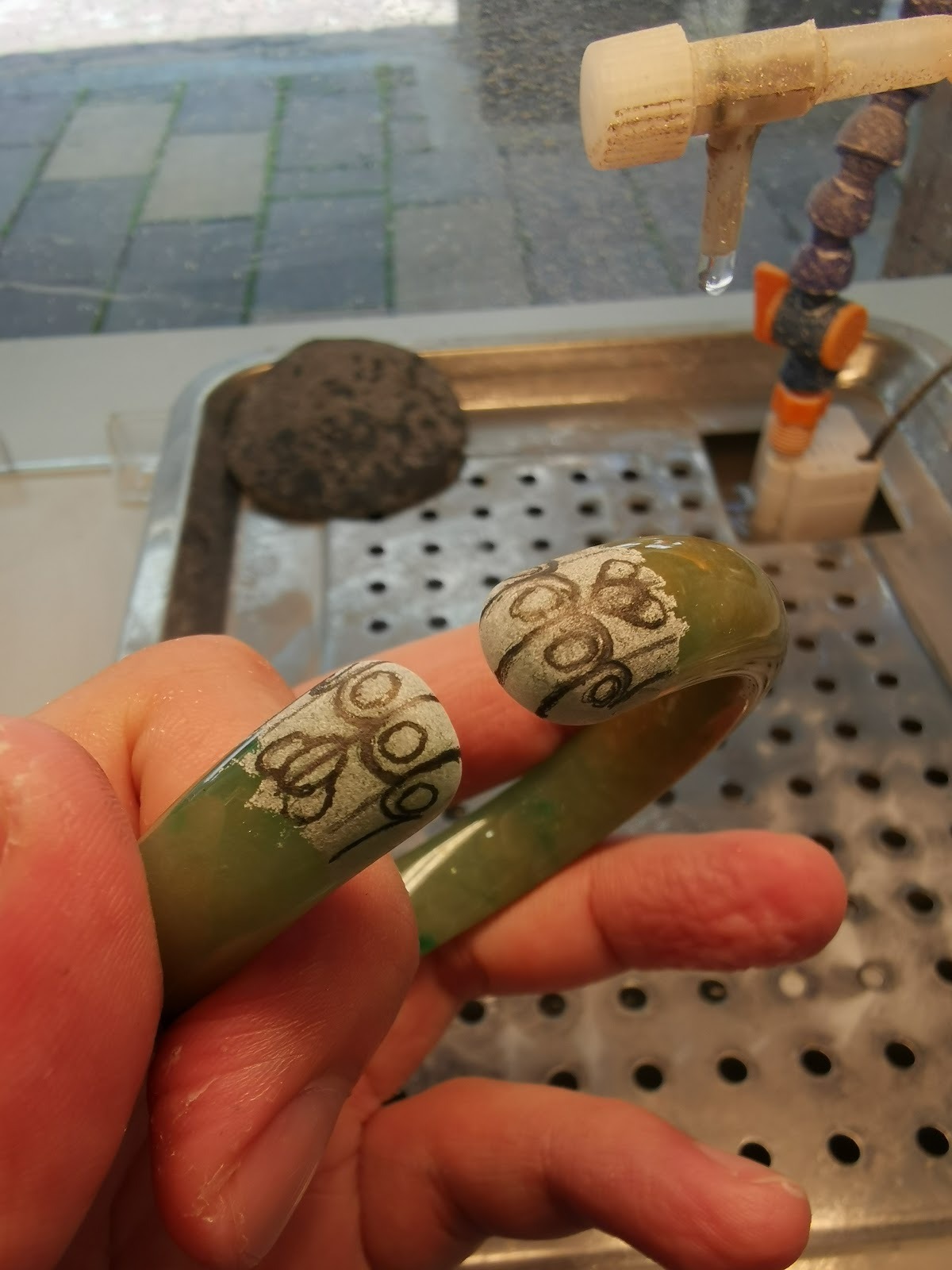 - 裂痕切割與視覺處理:蔡汶諺老師會精確切割手鐲的裂痕區域,寬度經過嚴格拿捏,避免二次受損。切割後,裂痕處的玉石結構在視覺上會轉為「透明化」,從而消除客人看到裂痕的心理不適,達到「裂痕不見了」的效果。