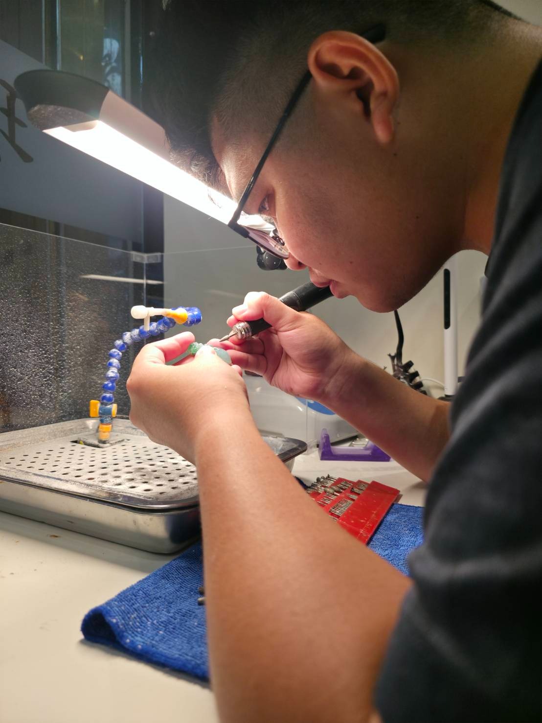 蔡汶諺老師在大學時期,便決定遠赴中國拜師學藝,到朋友的工廠拜師學藝,廠擔任學徒。這段經歷並非輕鬆的藝術學習,他必須肩負起傳統師徒制下的所有雜務,洗衣、做飯、幫忙照顧師傅的小孩,加上每天待在機台前、粉塵裡,反覆練習打料、開料、磨、雕、拋光。 他很清楚, 當時臺灣的玉石加工多偏向較粗獷的「石雕」,若要掌握精巧細膩的「玉雕細工」,必須到當時擁有完善產業鏈和環境的中國去學習。他在那裡磨練了四年多,從一塊原石的紋理與裂隙判斷開始,一路學到如何在有限的材料裡做「減法」,一刀一刀把多餘的部分拿掉,只留下最適合的形體。 這段扎實的磨練,讓他不只是雕刻者,也成了一位理解玉性、懂得照顧玉石的修護師。疫情爆發後,他回到臺灣,成立了自己的工作室,決心將這門傳統技藝傳承下去。