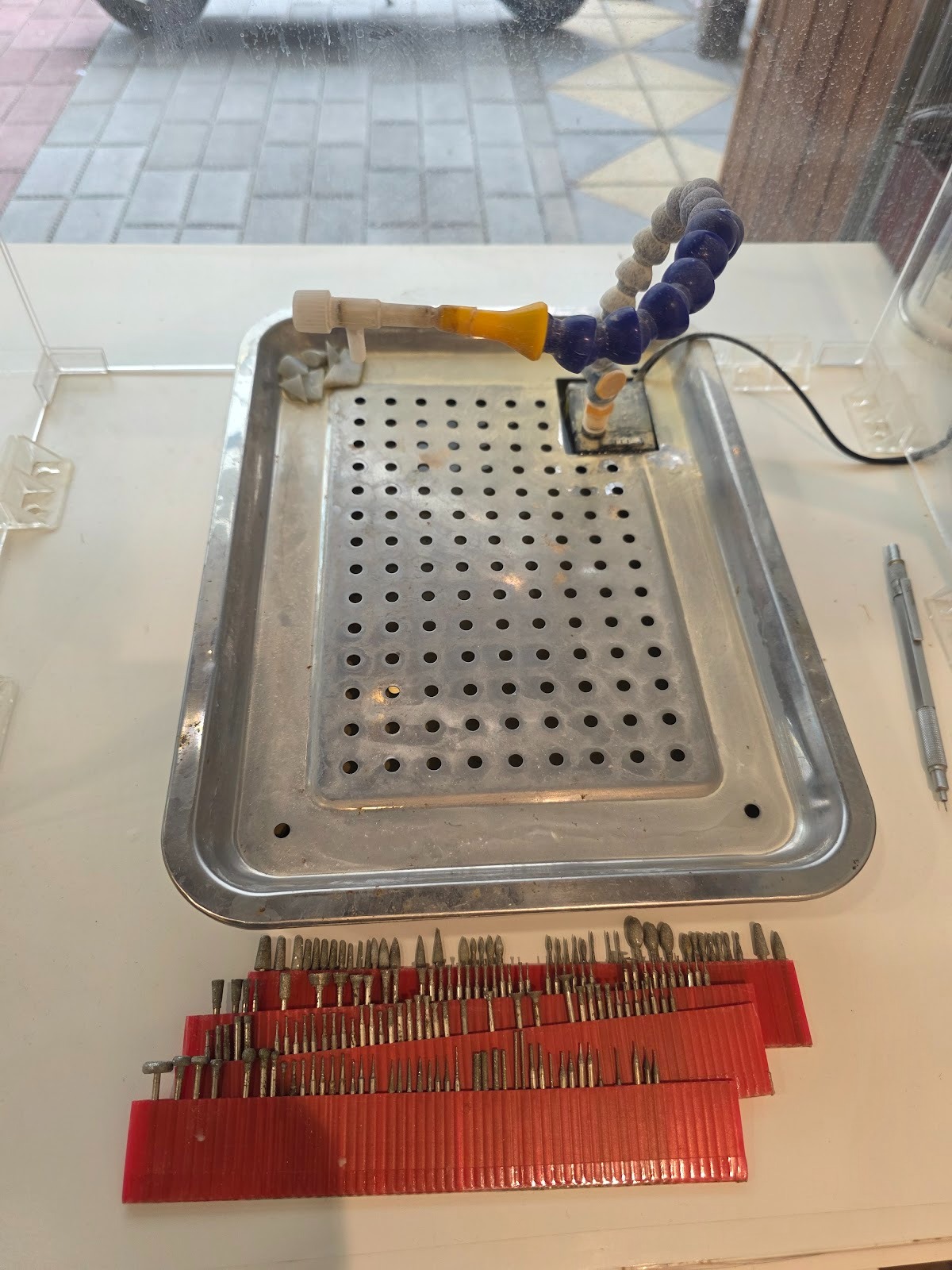 修玉,和其他材質不同,是一門純粹的「減法工藝」。 碎掉的部分無法黏、無法補,只能靠形體重塑讓它恢復平衡。老師在燈下仔細觀察玉石的晶體結構,確認鼻翼破損的深度與受力方向,最終決定以「整型」的方式,讓貔貅的五官重新達到協調與平衡。