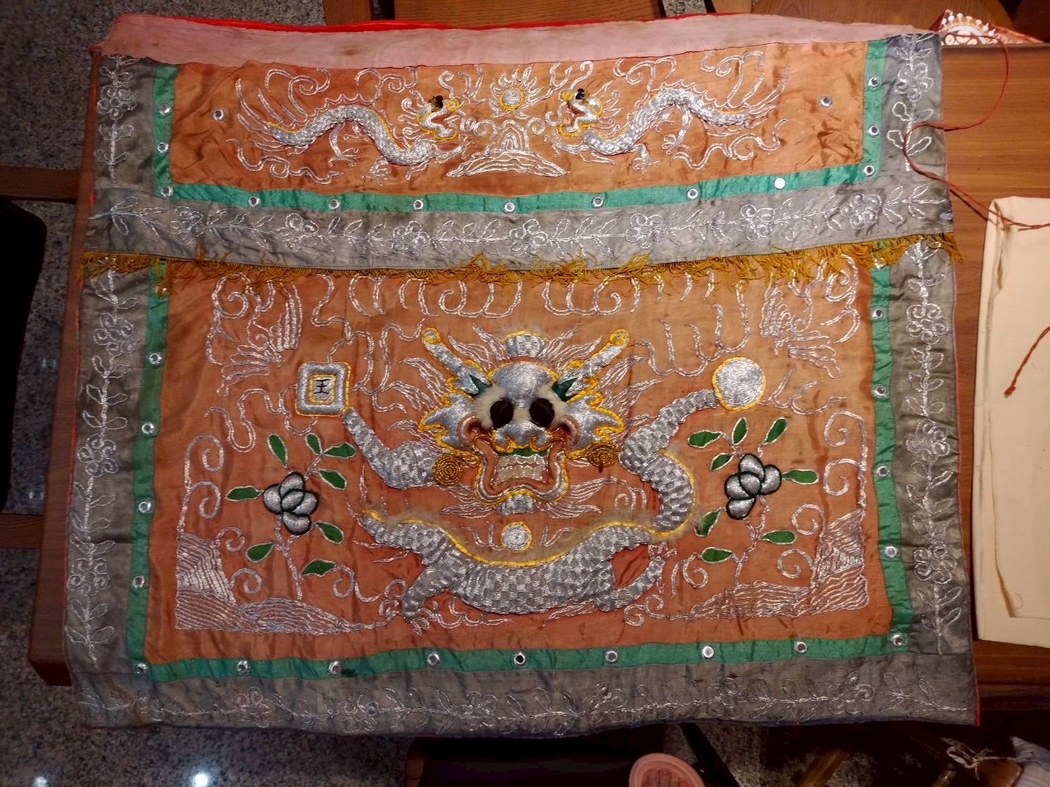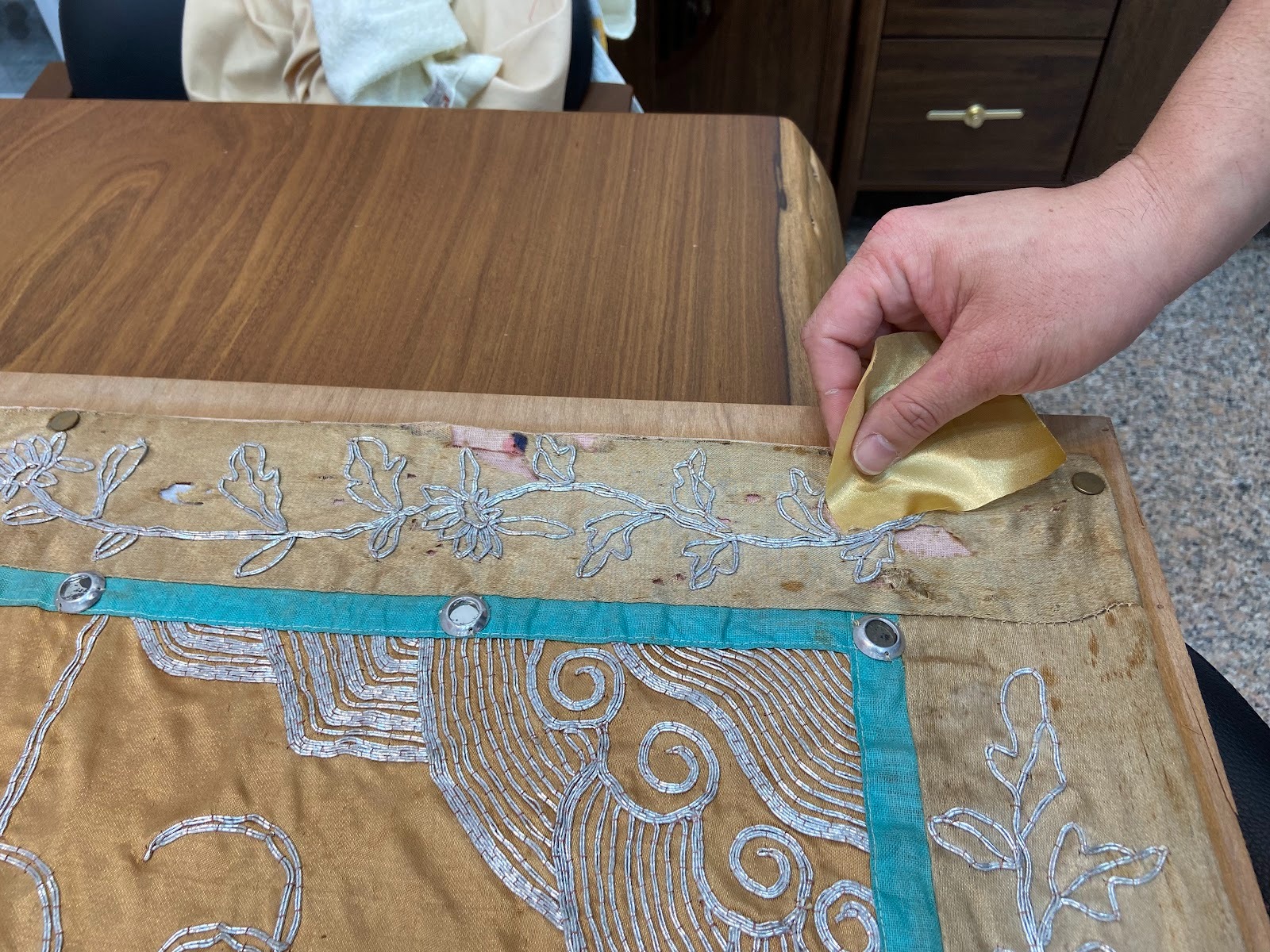 3.受力點轉移: 使用現代的宗教專用棉布在背底做加厚(加固處理),讓整塊桌裙的受力點轉移到新布上面。