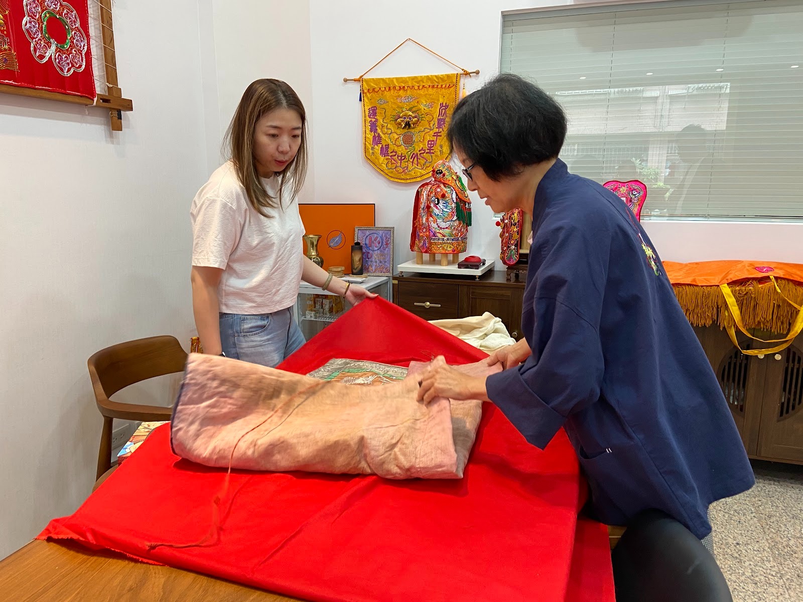 新秀繡莊不只是販賣,更是一處充滿人情味的「互動式繡莊」。林昊漢深知,客人帶來的不僅是受損的布藝品,更是已逝親友、家人的靈魂與故事,這也是他判斷是否值得修復的唯一標準。修復工作充滿風險與極高成本:一件當年價值三千台幣的神明衣,如今可能已值十五萬,但修復過程可能導致文物永久失去,且強度不如從前,這是一場賭上財富與記憶的巨大賭注。因此,林昊漢堅持將修復過程公開,以「實境秀」的方式透明化,並透過錄影、簽訂切結書,甚至有時需要律師協助來與客戶達成共識。他更將傳統尺寸(寸)改為公分,追求「不落肩、貼身、長度剛好」的古法精準尺寸,以企業管理思維,確保每一件作品都能圓滿交出,實踐對客戶與神明的承諾。