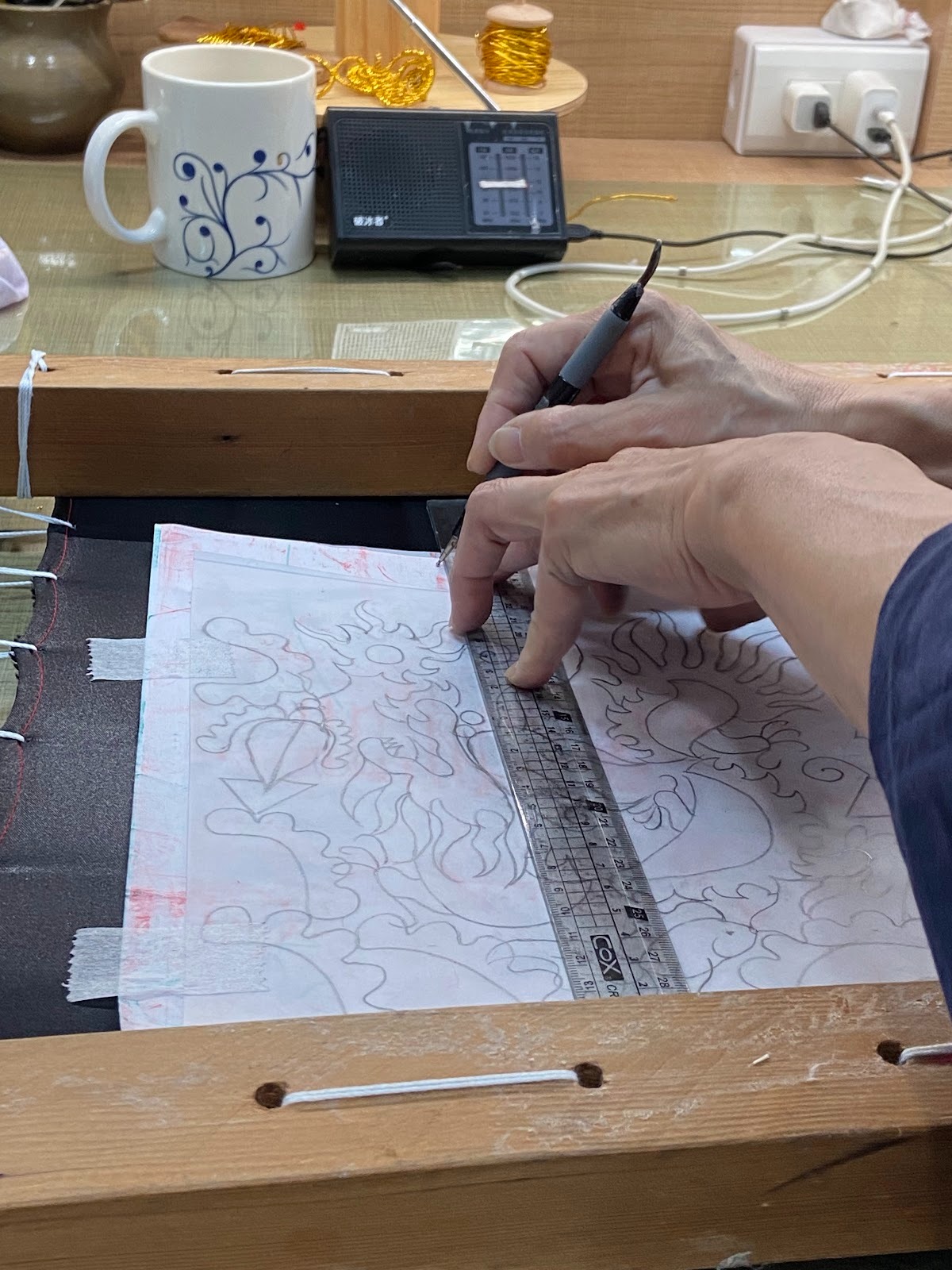 - 破損處內補與固定: 針對破損的地方,用新布內補,並在破損處從上面蓋一塊布,以同樣顏色的線將其固定,防止外層繡線持續脫落。