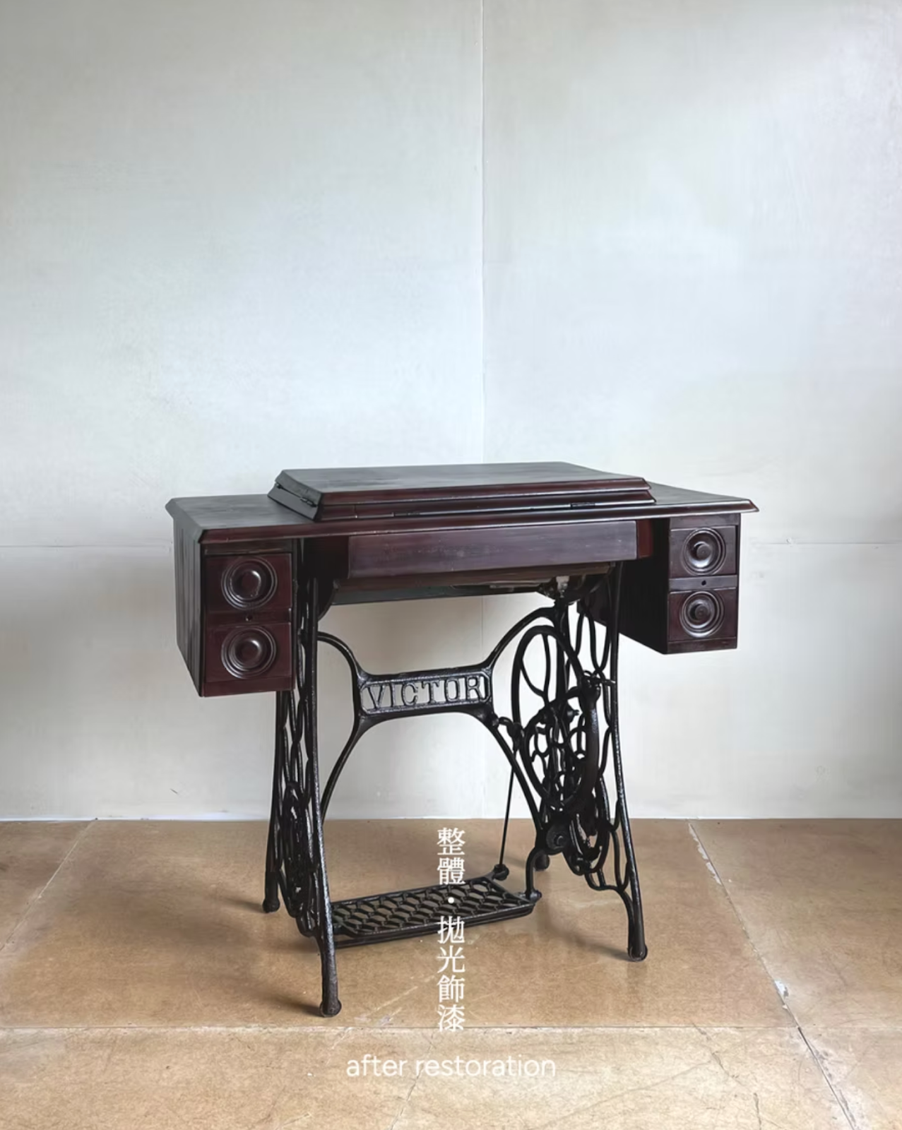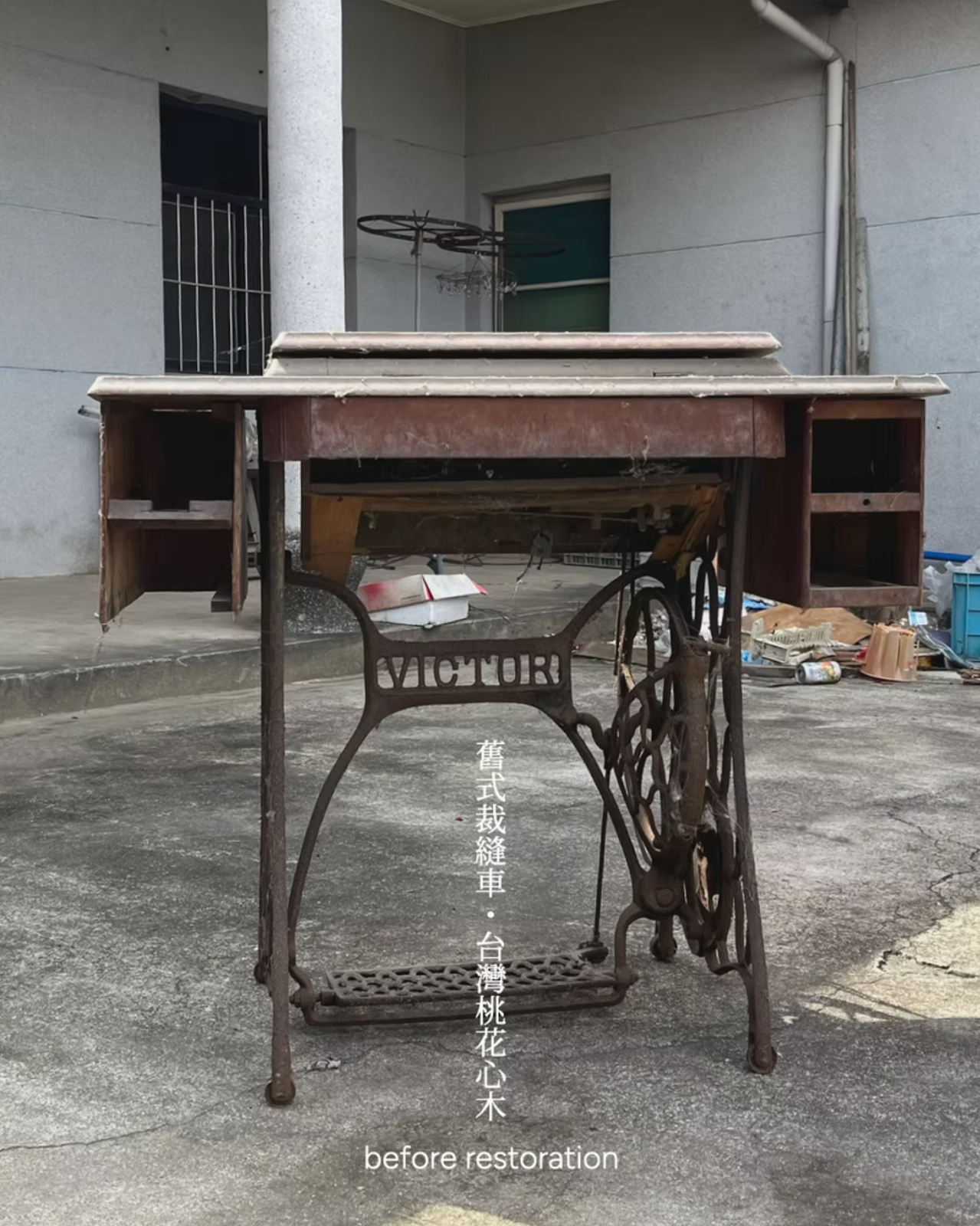 這件委託是一台日治時代留下的裁縫車——Victor 鐵腳結構搭配桃花心木桌座,是委託人媽媽的嫁妝,也是縫紉歲月的象徵。委託人希望能夠完整保留其經典造型,並特別要求重建原本對稱的抽屜輪廓,讓這份嫁妝能夠世代傳承。然而,這台裁縫車的初始狀況令人心疼:它歷經多年潮濕與塵封,表面塗裝脫落、木材暗沉且有發霉痕跡;結構鬆動,左側兩抽屜已遺失;最底層的 Victor 鐵腳也嚴重生鏽,踏板卡滯不順。這是一場功能性與美學的全面修復工程,考驗著師傅的經驗與細心。