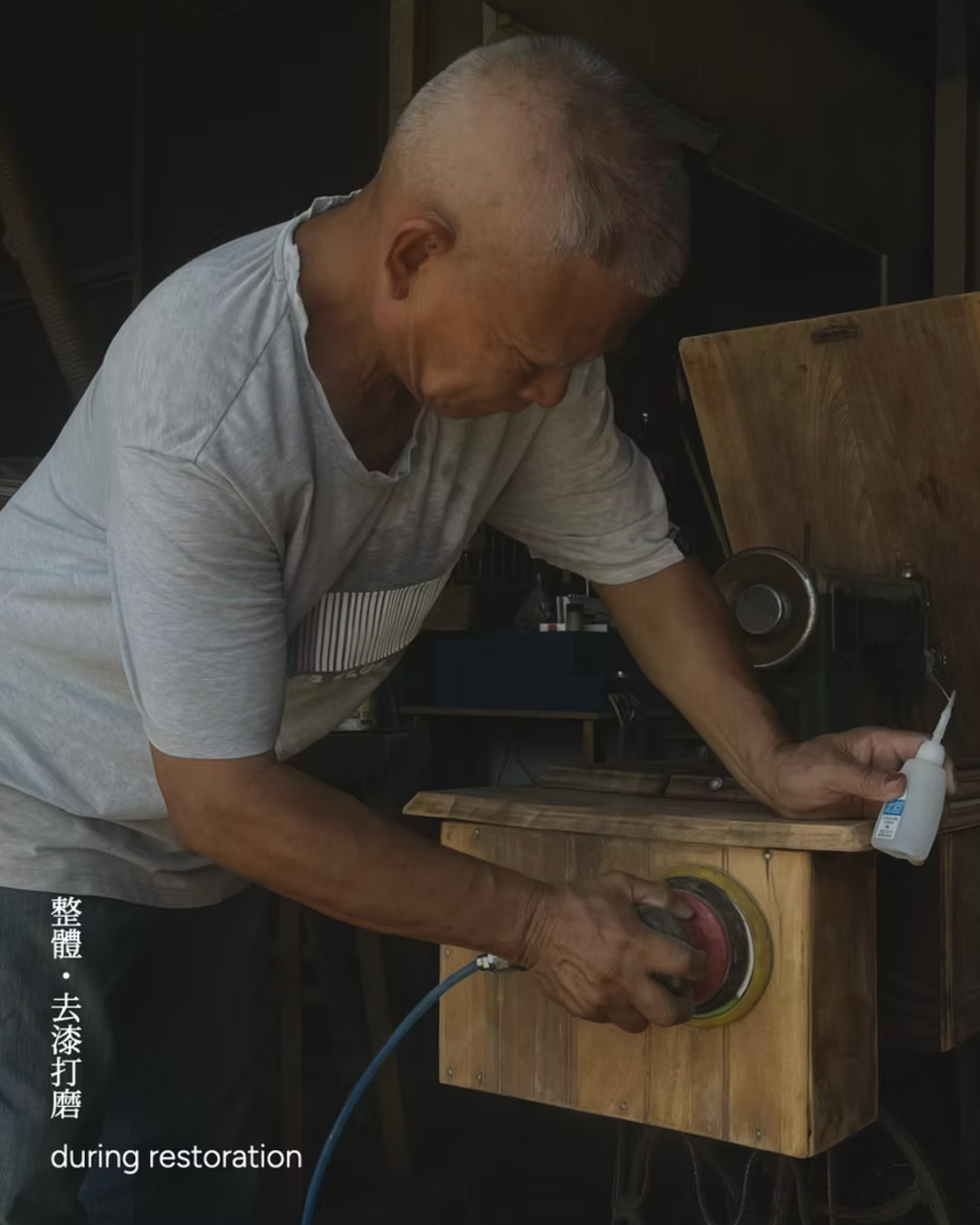 一台老式裁縫車靜靜躺在工作桌旁,桃花心木因潮氣而變得暗啞,Victor 鐵腳覆著一層沉沉鏽斑。蔡家璋師傅俯下身,指尖沿著發霉的木面與鬆動的榫接處滑過,仿佛能從這些傷痕中觸到當年日治時期母親縫補衣衫的身影。這台陪伴一個家庭跨越數十年的嫁妝,如今等待著被重新喚醒,重新走回生活。