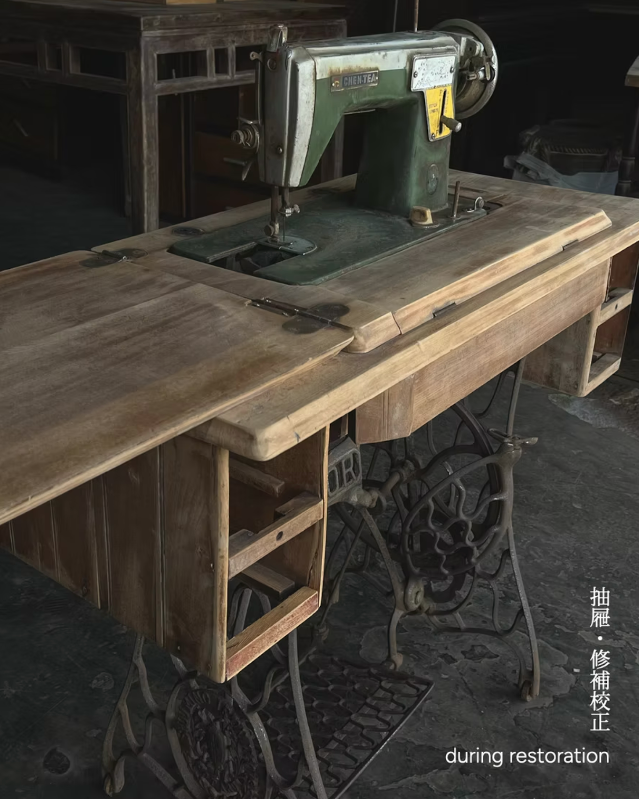 - 功能與結構重建: 裁縫車的挑戰在於抽屜重建。由於左側兩抽屜已遺失,師傅憑藉豐富的家具製作經驗,依據右側抽屜的原尺寸進行手工復刻,並校正安裝,讓原本對稱的輪廓得以完整。
