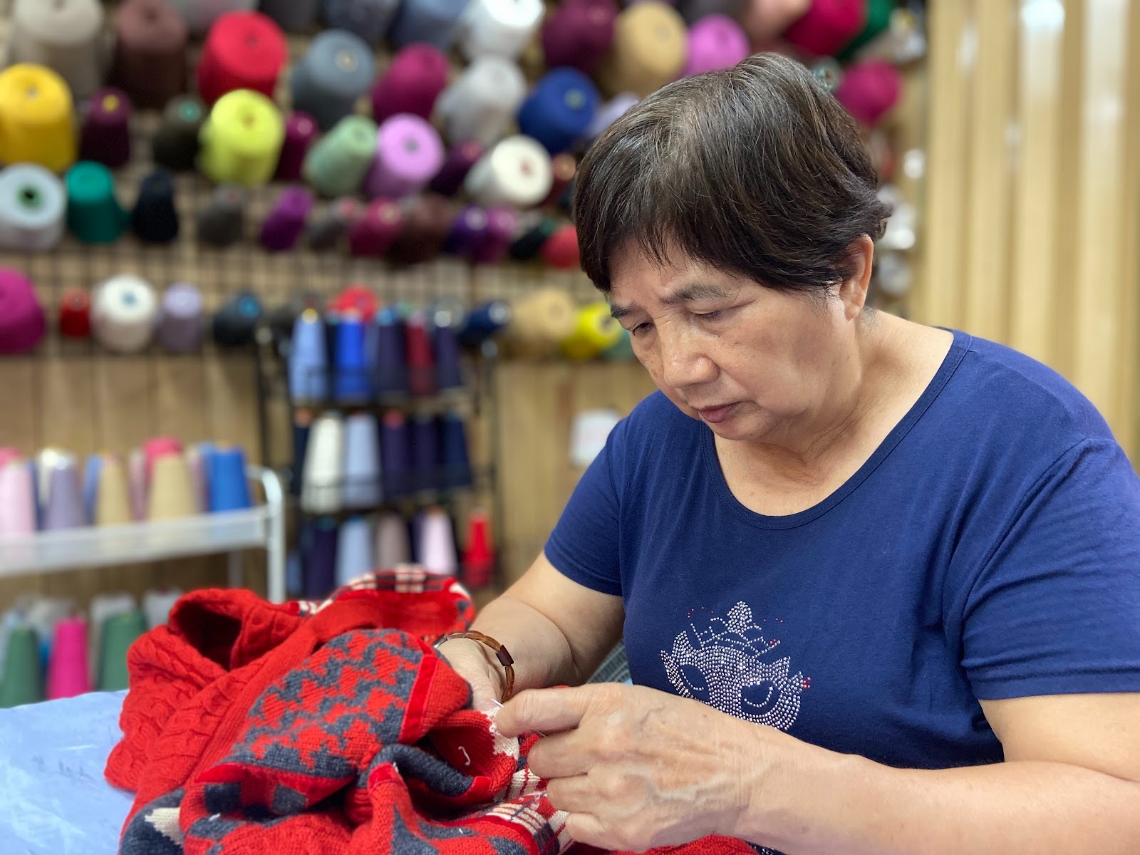 在巧欣針織社的工作空間裡,一整面牆掛滿成排紗線,從米白、霧粉到深墨綠,像一座低調卻飽滿的顏色圖書館。員工穿梭在車縫機與織片之間,有人低頭勾線,有人細心對齊布面針目。陳泉良老闆拿起一件年代久遠、破了一大洞的毛衣,指尖在破口邊緣停了一下,輕聲說:「這種衣服,如果可以再穿十年,就是它最大的價值。」