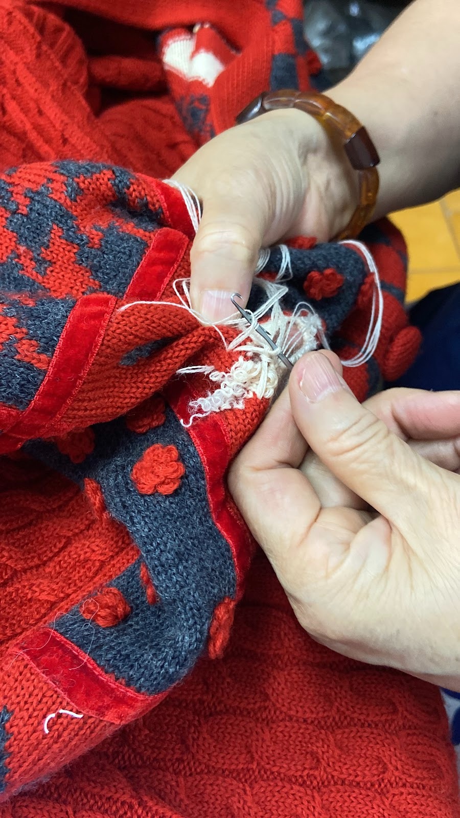 - 輔助服務: 對於像這件衣服有包釦或扣子脫落的狀況巧欣會一併順便處理,如用紅色的線幫毛衣把扣子順便縫進去。