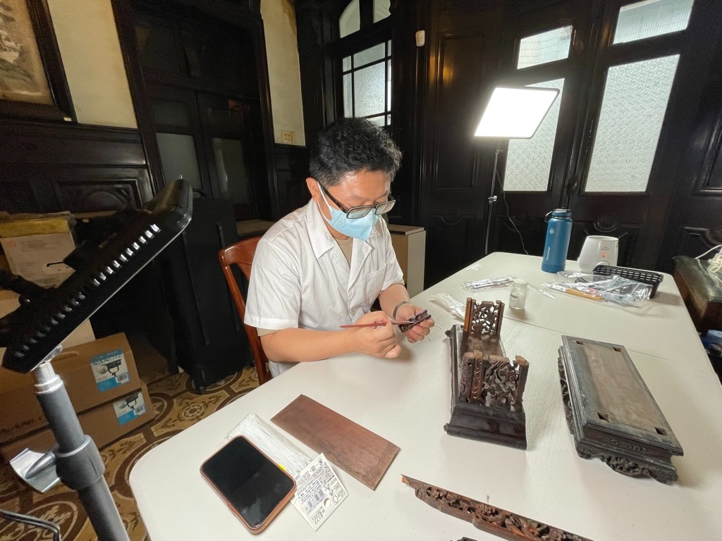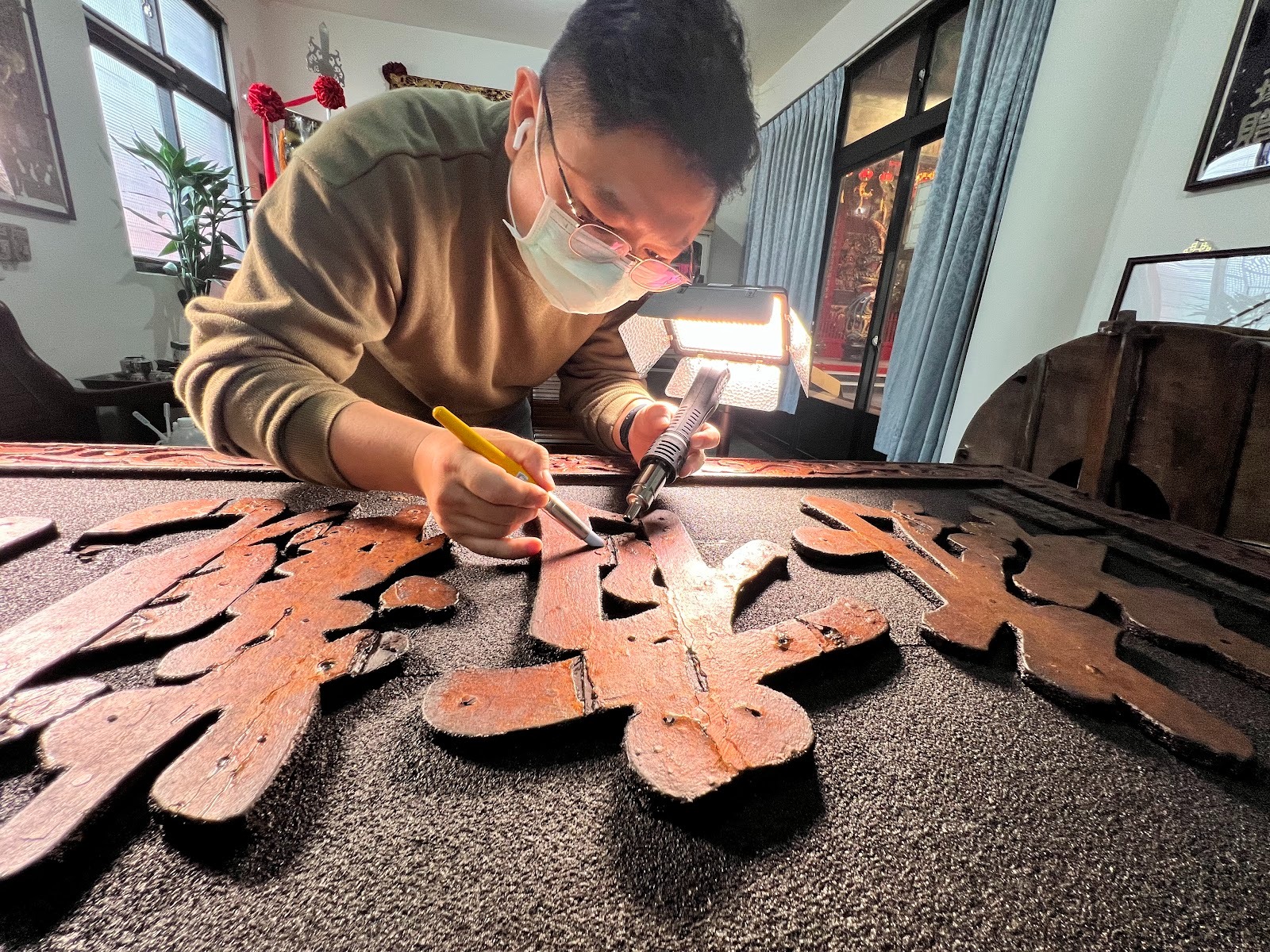 潔白的工作檯邊,畫筆、刻刀和各式精細工具一字排開,像是準備上陣的醫療器械。莊竣傑修復師戴上手套,俯身貼近木雕神像的表面,沿著一道細長裂痕輕輕觸摸,確認裂痕的深度與走向。對他來說,眼前的不只是木頭與彩漆,而是一段地方信仰與歷史所累積的重量。