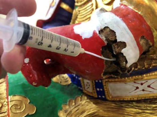 - 清創與加固: 針對李俊將軍腳踝等斷裂處,先進行清創。接著使用 B72 樹脂進行黏合與固結,並利用 OH100 灌注於深層裂縫,解決泥塑本體粉碎性損害的結構問題。