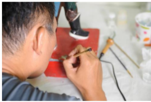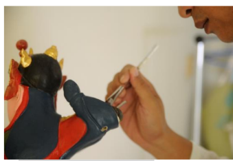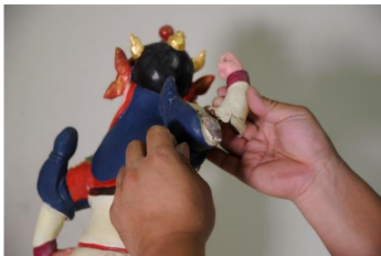 3.材質黏合與填補:選用成分較偏向中性的修復材料。使用較接近原材料的動物膠混合高嶺土進行填補。使用有機矽(二氧化矽)來加強神像的內部結構穩固性。