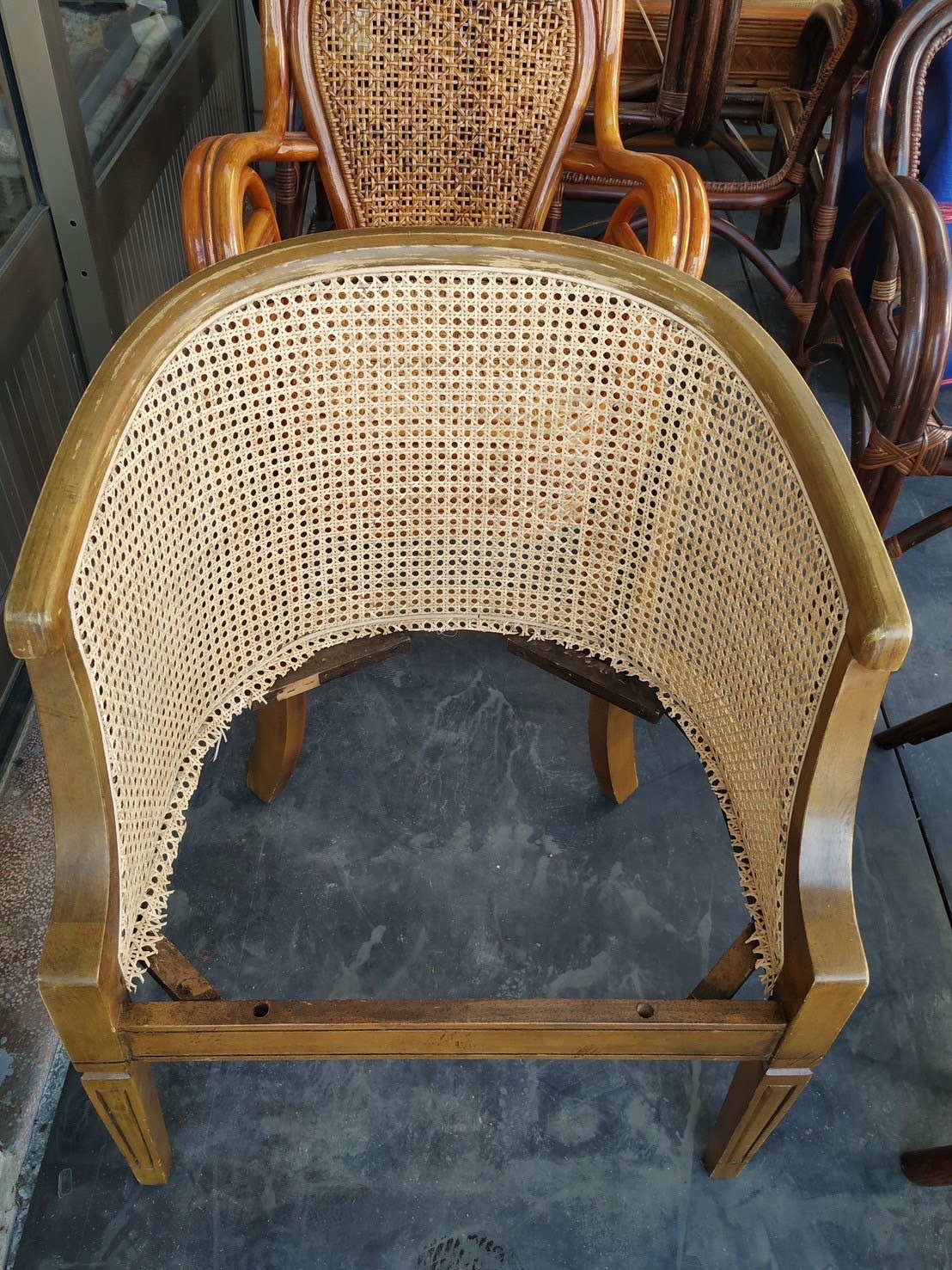 - 結構淨化與拆解:首先移除顧客自行加固的電線、膠帶、鐵釘等不當修補物。拆除破損的編織藤面,並小心翼翼地一根根拔除原廠隱藏在溝槽內的封槍釘。清理原有的舊膠水和殘渣,為後續工序做好準備。