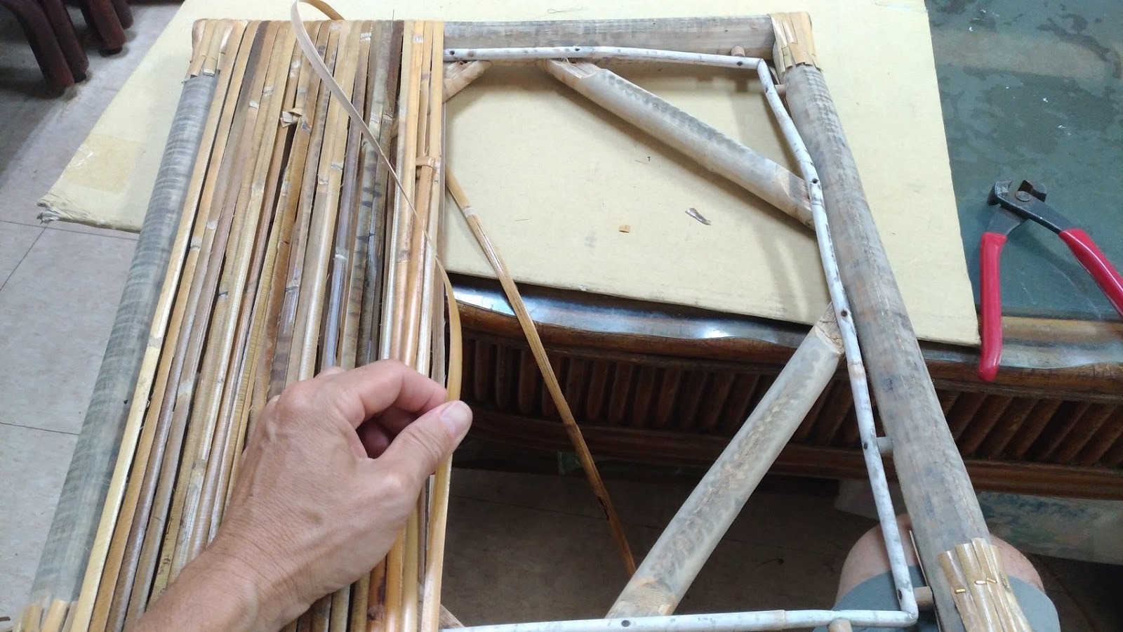 - 固定與收邊:將編好的藤面在溝槽內均勻塗抹白膠,並使用工具敲打壓入固定,等待其乾燥後繃緊。最後,再用藤心覆蓋溝槽,完成收邊。