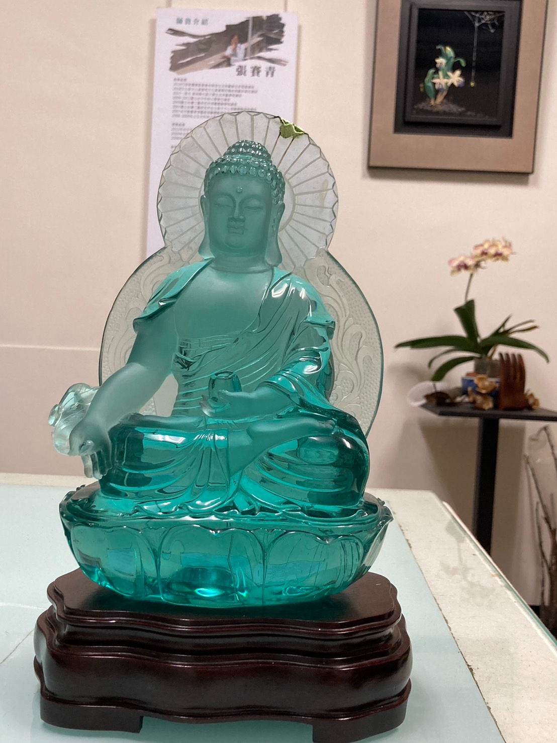 張賽青老師在一間慈善機構協助維護時,接手了這件琉璃佛像, 這個佛像承載著一戶人家的信仰與寄託。物主一家飽受癌症所苦,父親因癌症過世,妹妹和女兒也身患不同種類的癌症。這尊佛像在九二一地震時翻落,導致光環缺了一角一直無法修補,彷彿象徵著一家人努力支撐的信念在無情災難下被撕裂。佛像破損的這段時間,物主妹妹的身體狀況非常不好,甚至休學無法上學。慈善機構的朋友察覺其承載的意義,便轉介給張老師。 面對這樣的委託,張賽青老師明白這件修復工作不僅是技術問題,更重要的是可以給當事人心理一個安慰,因此即使面對前所未有的挑戰,張賽青老師也決定接下這份帶有情感意義的委託。