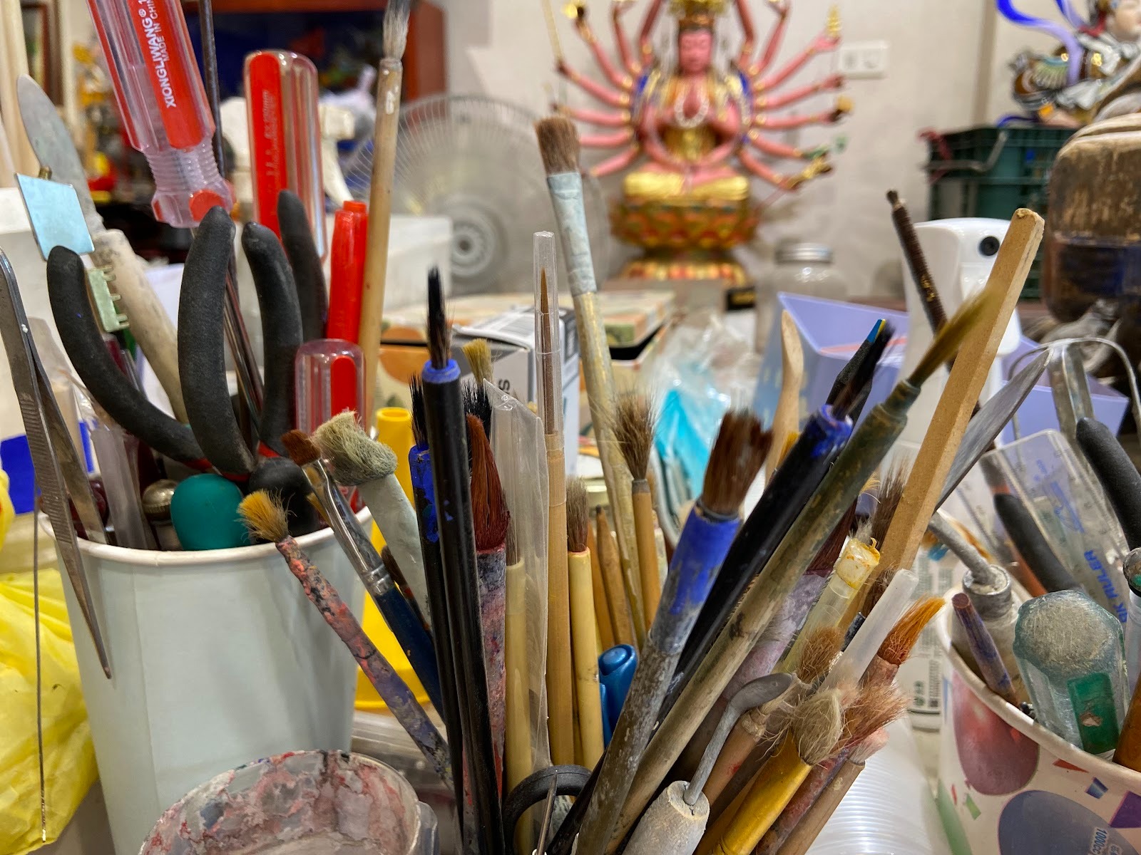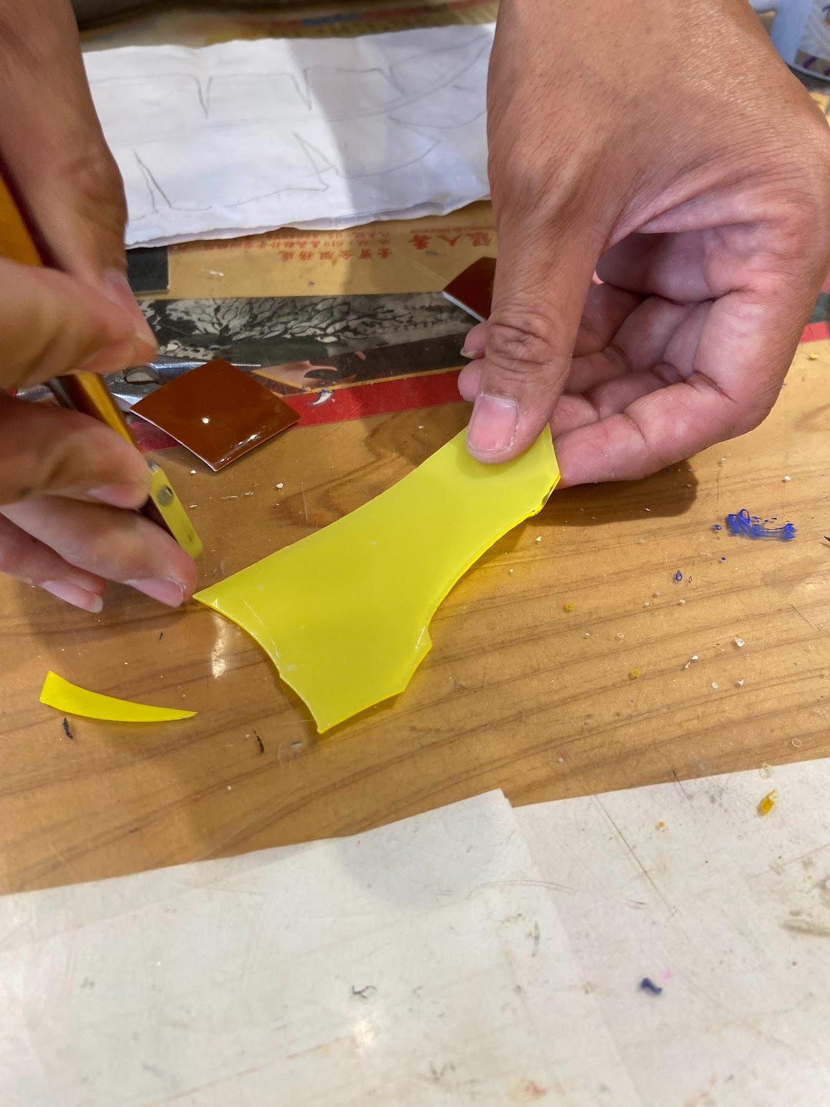 清晨的光線斜落在潔白的工作檯面上,兩把沉穩的 U 型鐵鉗與玻璃刀靜靜排列著,彷彿正等待下一場跨越時代的修復對話。林秉賢老師拾起其中一把工具,輕輕摩挲刀鋒。他眼前的不是冰冷的器具,而是陪他走過無數工地、承載著匠師技藝與歷史重量的夥伴。每一次切割、每一次嵌補,他修復的不只是物件,更是在替台灣剪黏工藝找回它的原貌與靈魂。