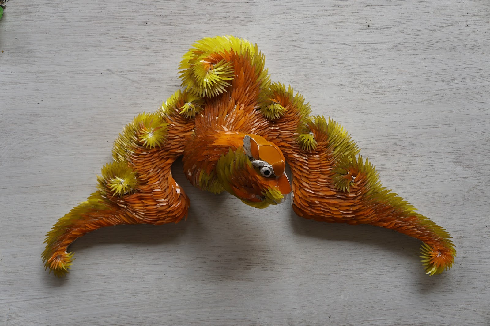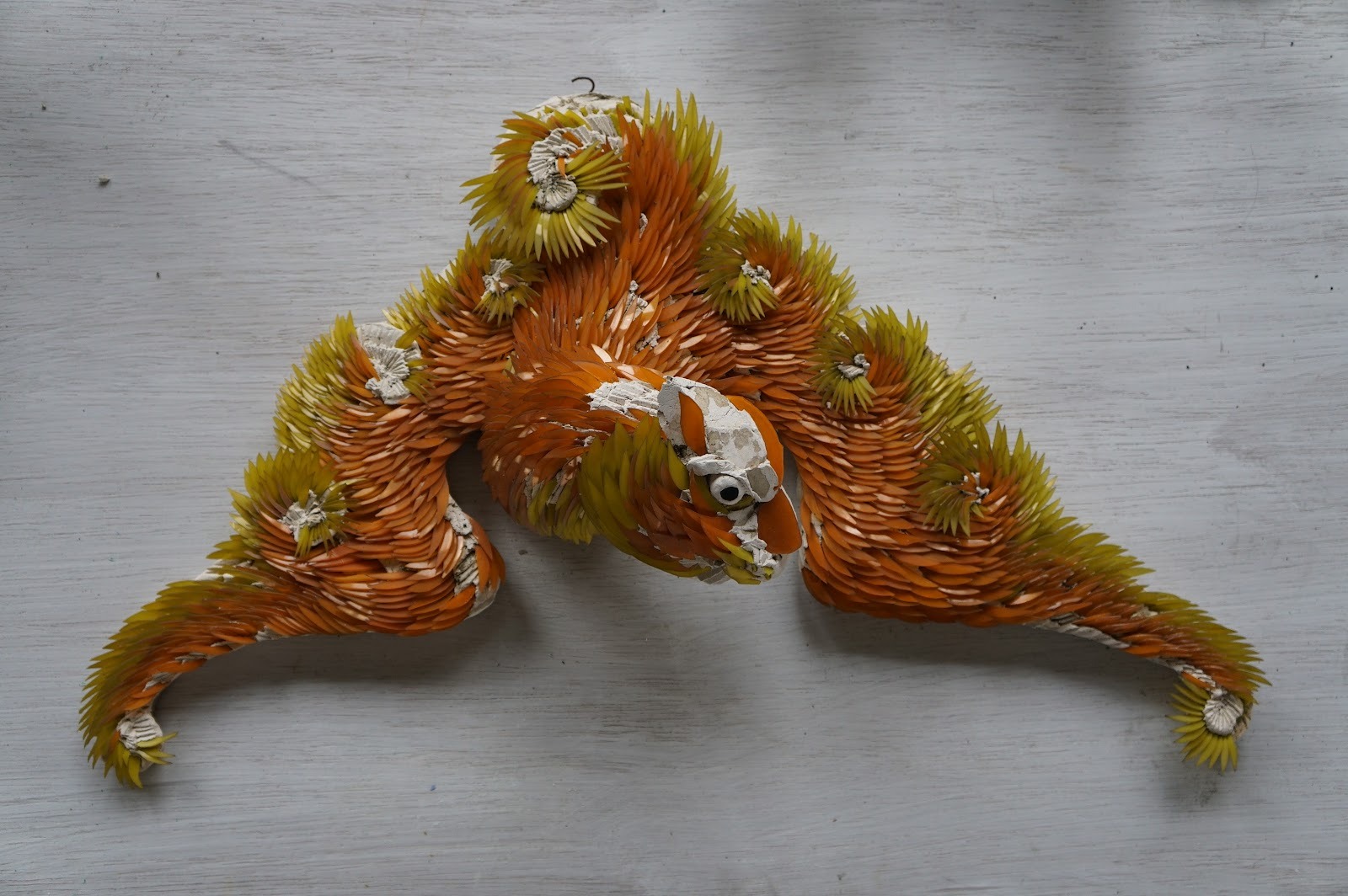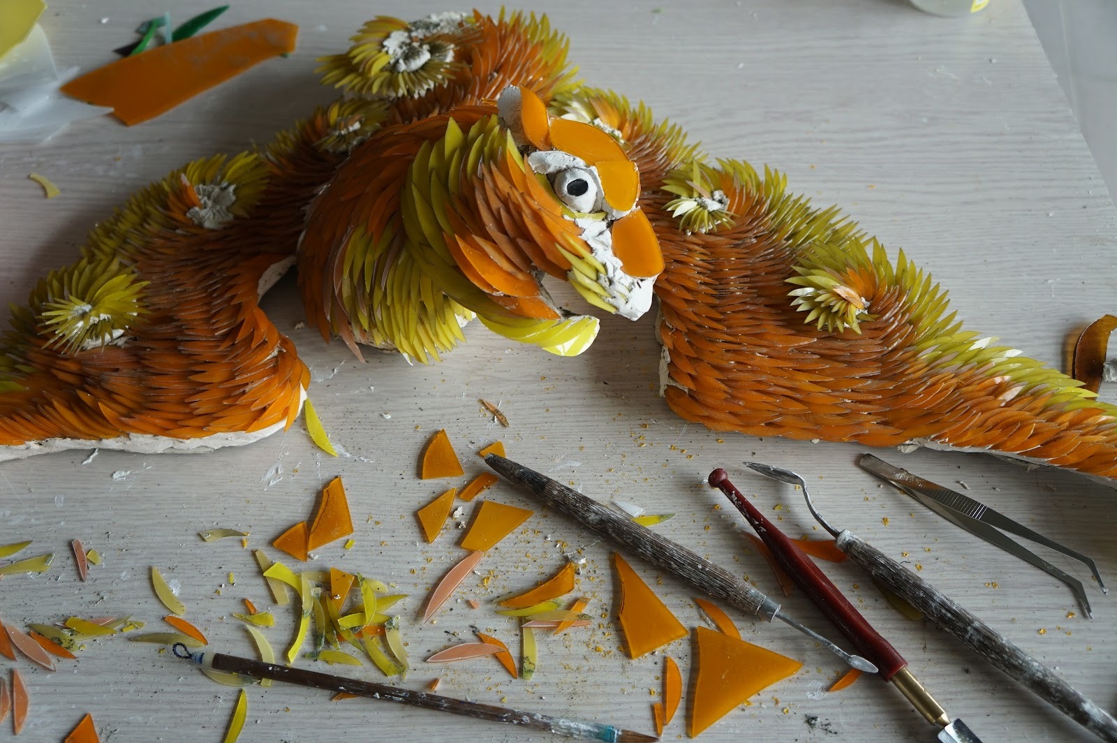 - 材料與切割:他使用鑽石玻璃刀精確切割出與原作相符的雙頭尖造型毛。頭部則切割成色塊貼上。由於蝙蝠的眼睛沒有壞,他保留了眼睛,只在周圍堆塑一顆圓形的球,並黏貼一塊玻璃,還原其神態。